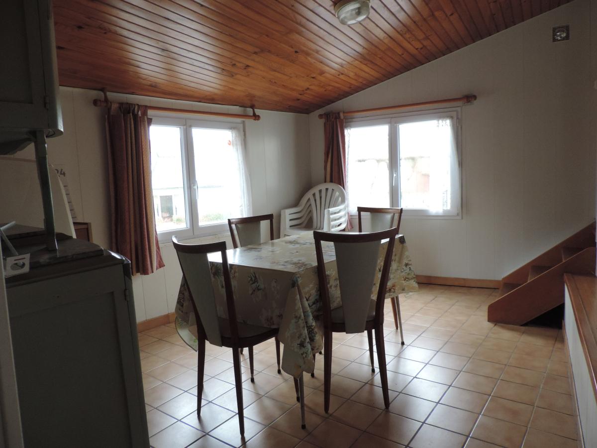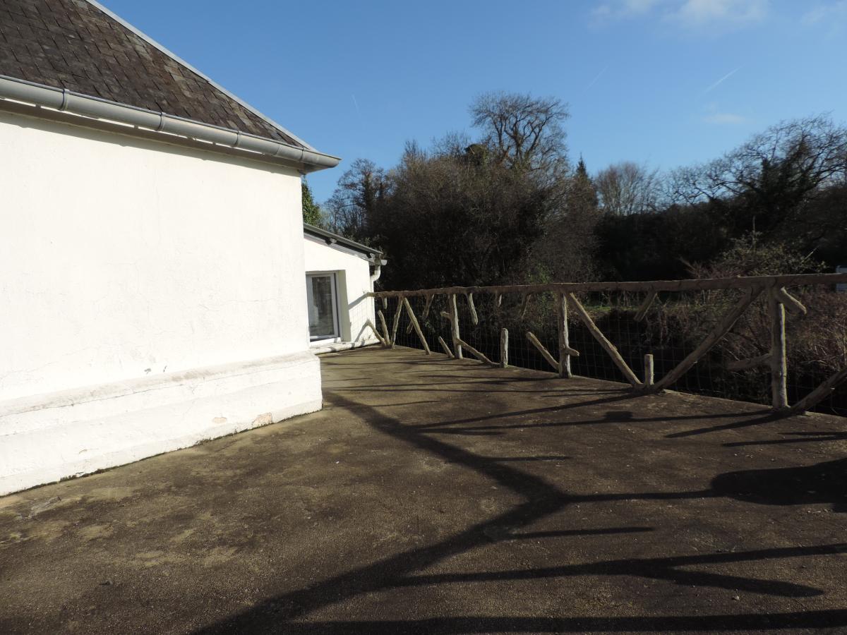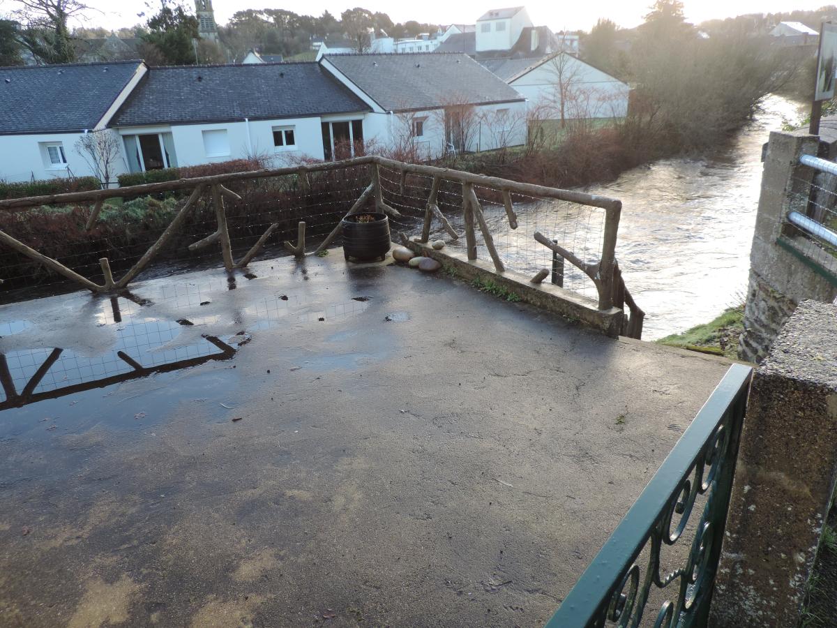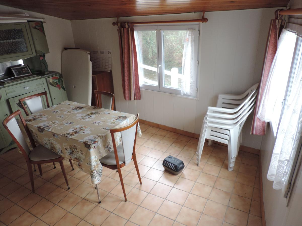 Surplombant la rivière, une maison d'environ 60m² comprenant : Une entrée/bureau, une cuisine, un séjour, deux chambres, une salle d'eau avec w.c, un débarras et une cave.
