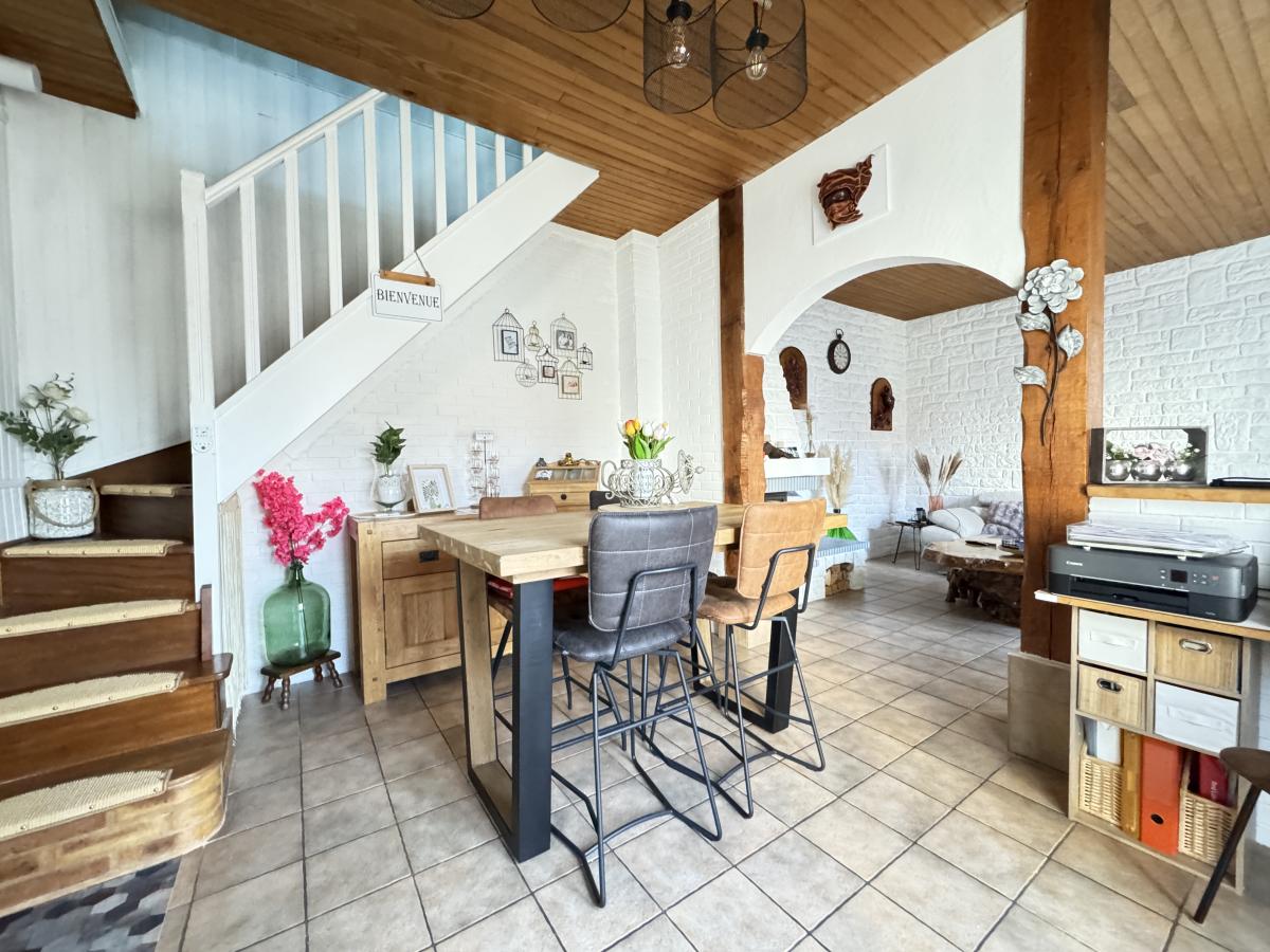 La maison se compose, au rez de chaussée, d'une entrée desservant une cuisine, un salon avec salle à manger offrant un bel espace de vie, ainsi qu'un wc.