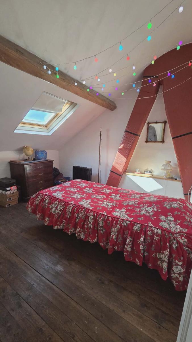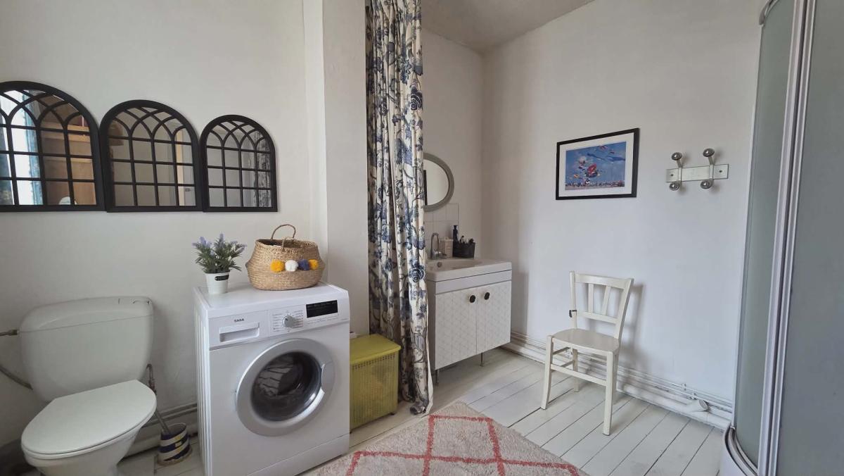 Offrant séjour salon avec cuisine ouverte, salle d'eau avec wc, trois chambres dont deux grandes, parquet au sol.