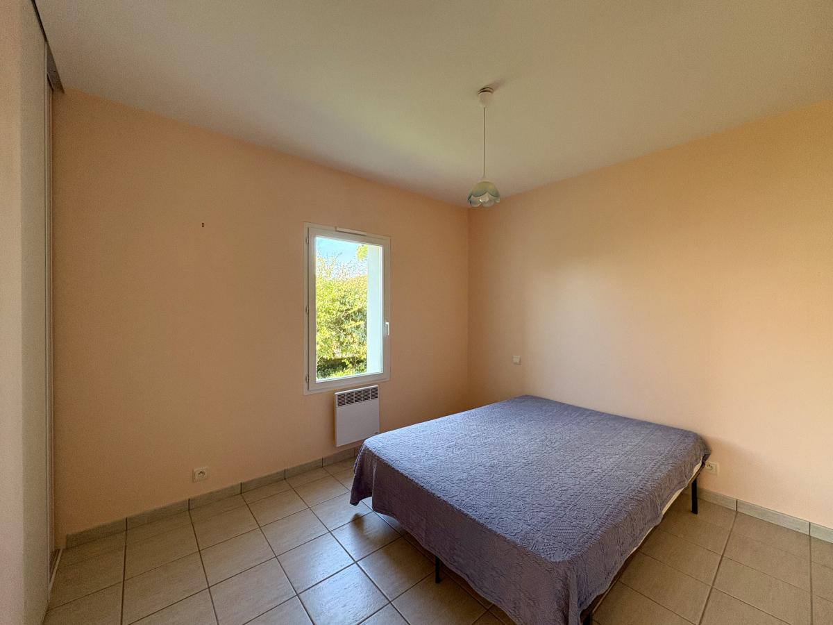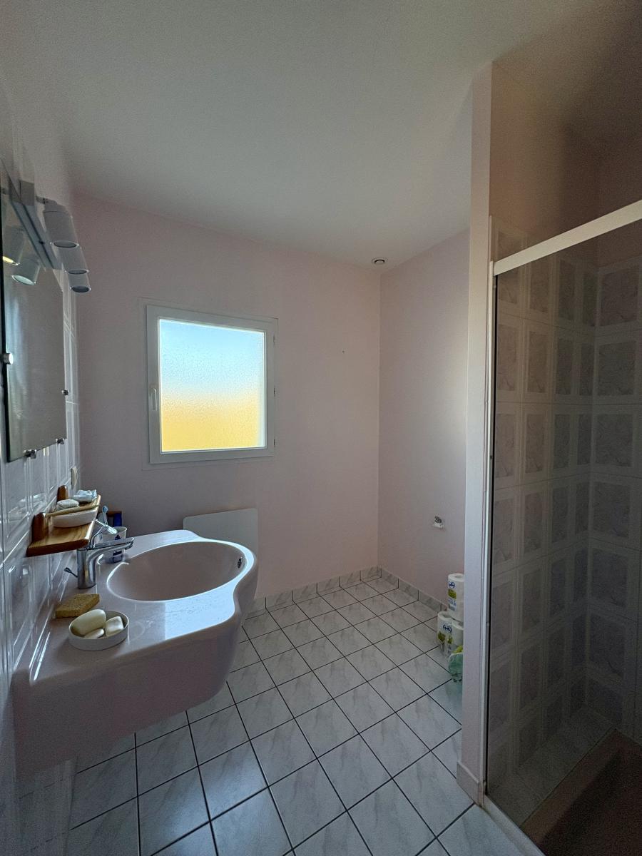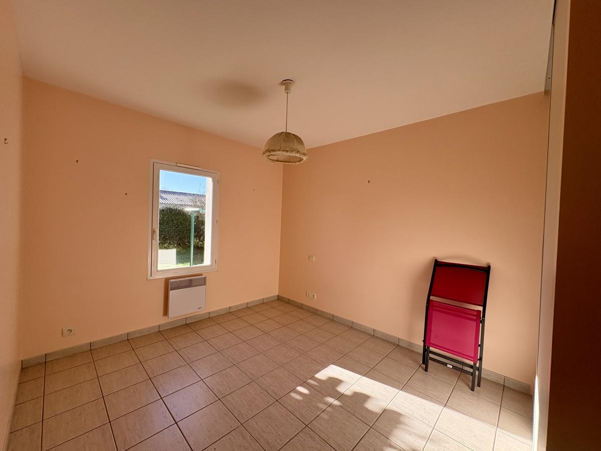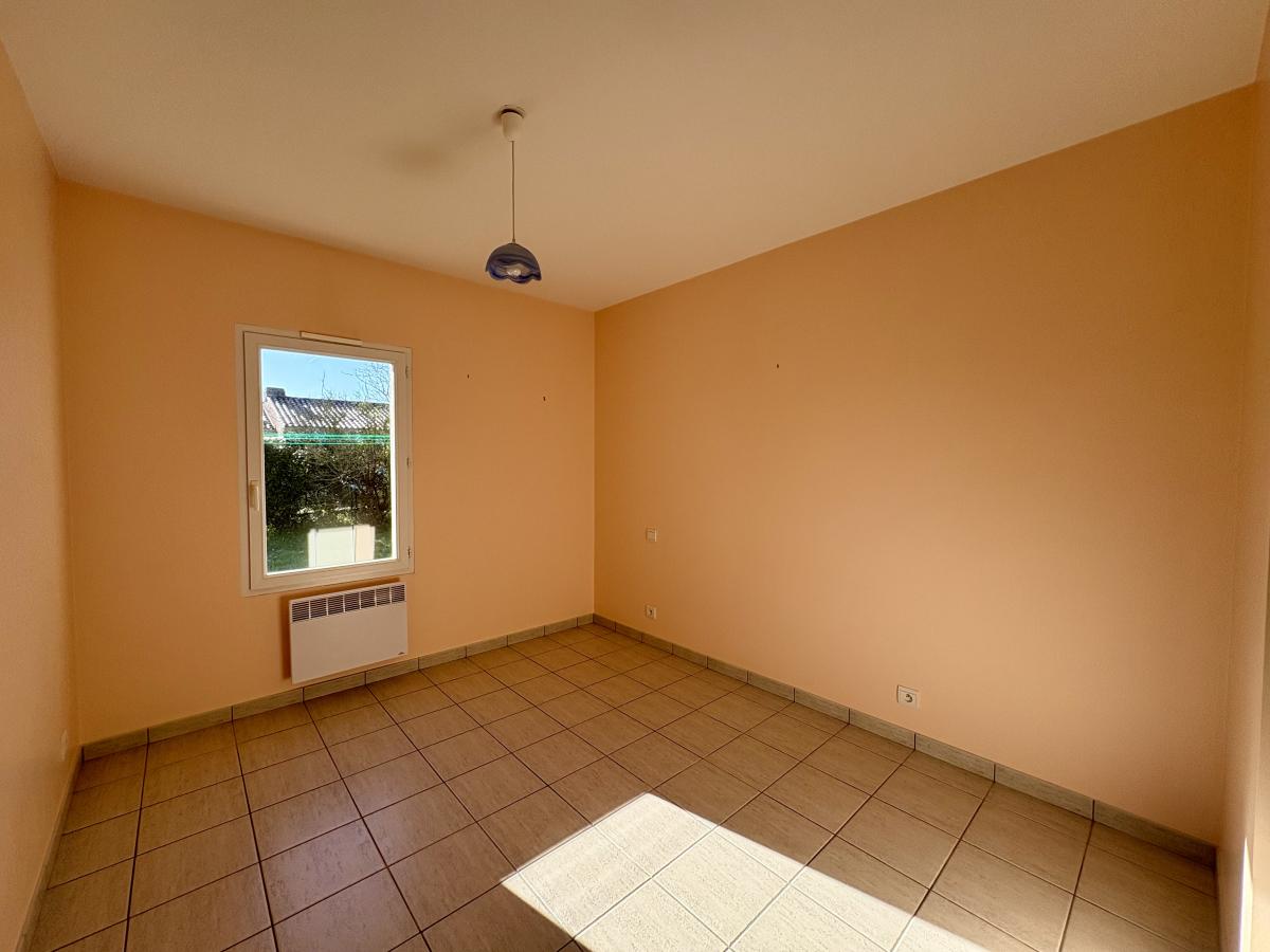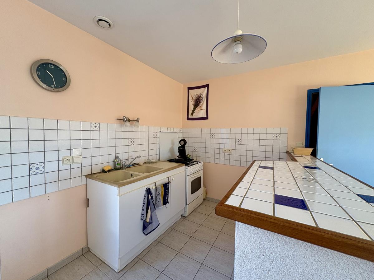 Une belle pièce de vie lumineuse avec un espace cuisine, un dégagement desservant WC, une salle d’eau et trois chambres avec placard.