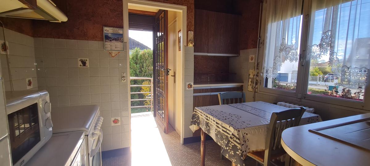 Entrée avec placard, cuisine, salon-séjour avec poêle à granulés, salle de bain, deux chambres, wc.