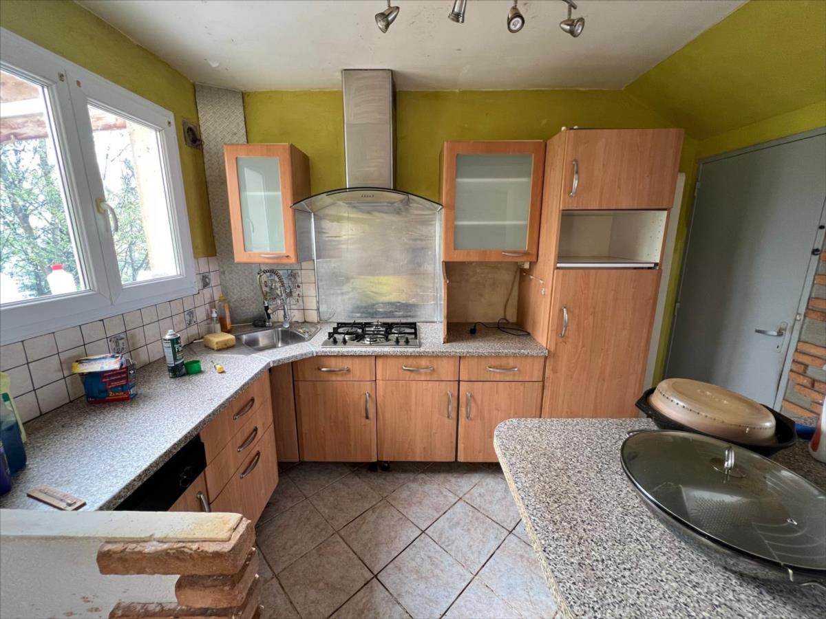 Sur l'arrière de la maison, terrasse accessible par la salle à manger, suivant sur un jardin.Menuiseries en PVC double vitrage avec volets roulants.Chauffage et production d'eau chaude via chaudière au gaz de ville.