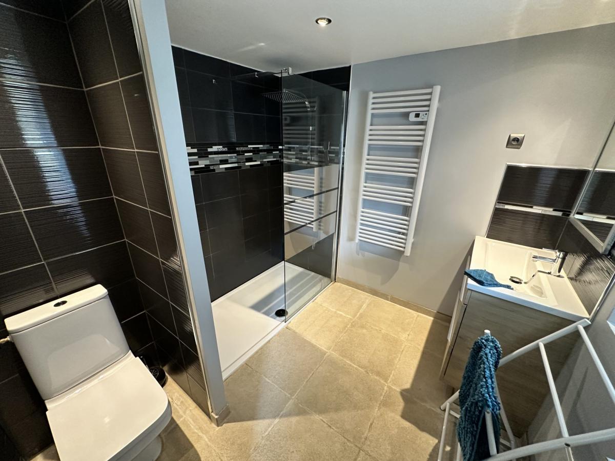 - Au rez de chaussée: séjour avec cheminée, cuisine équipée, salle d'eau avec WC et douche à l'italienne.