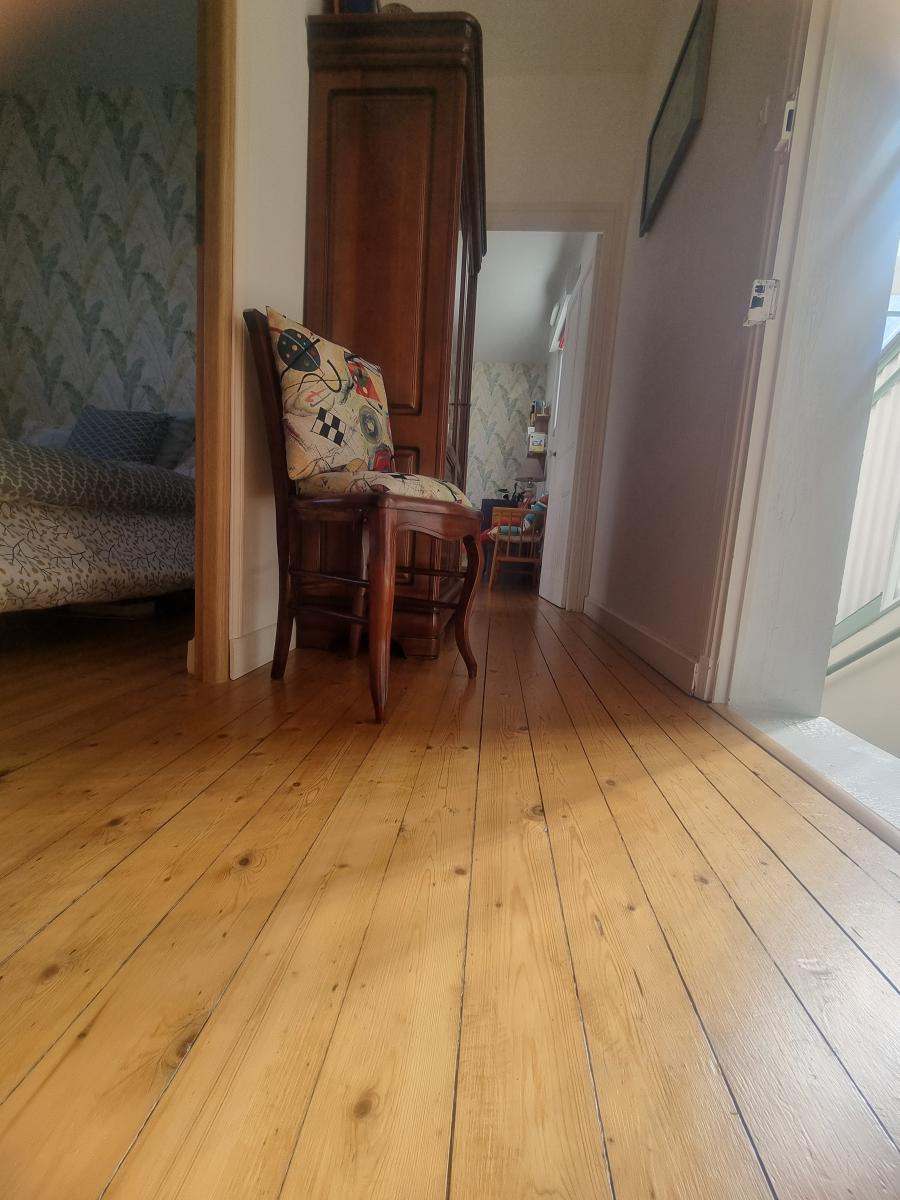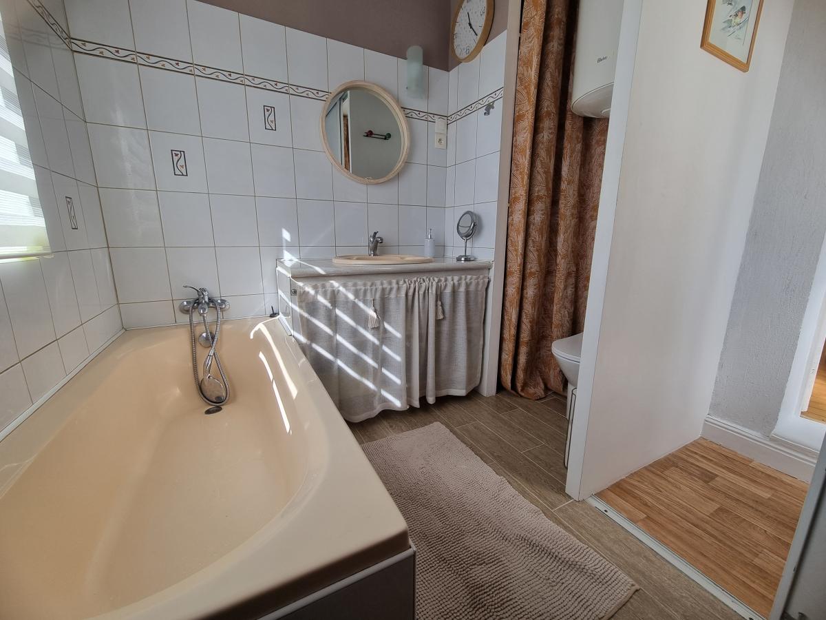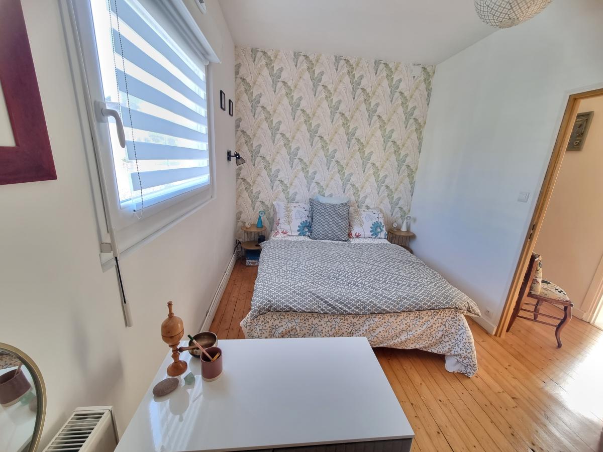 À l’étage, la maison dispose de deux chambres confortables, d’une salle de bain, ainsi que d’un grenier offrant un espace de rangement supplémentaire ou un potentiel d’aménagement.
