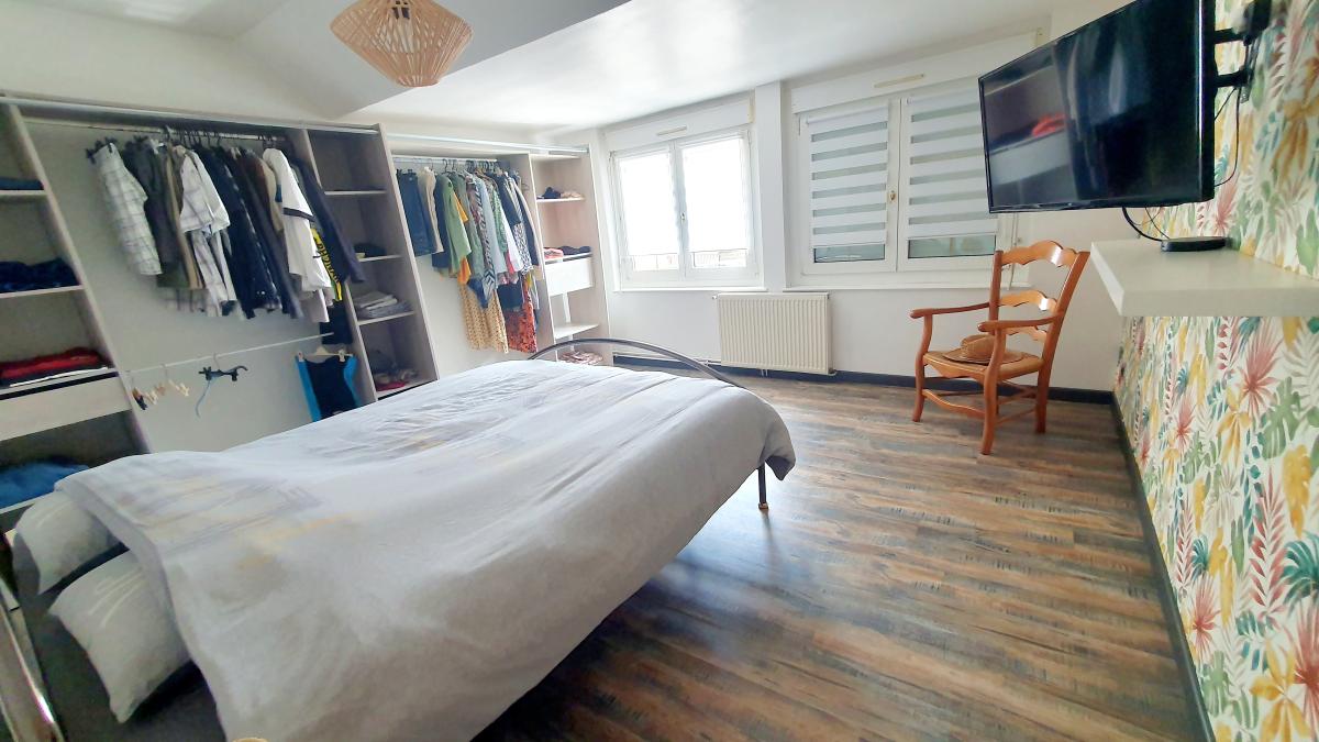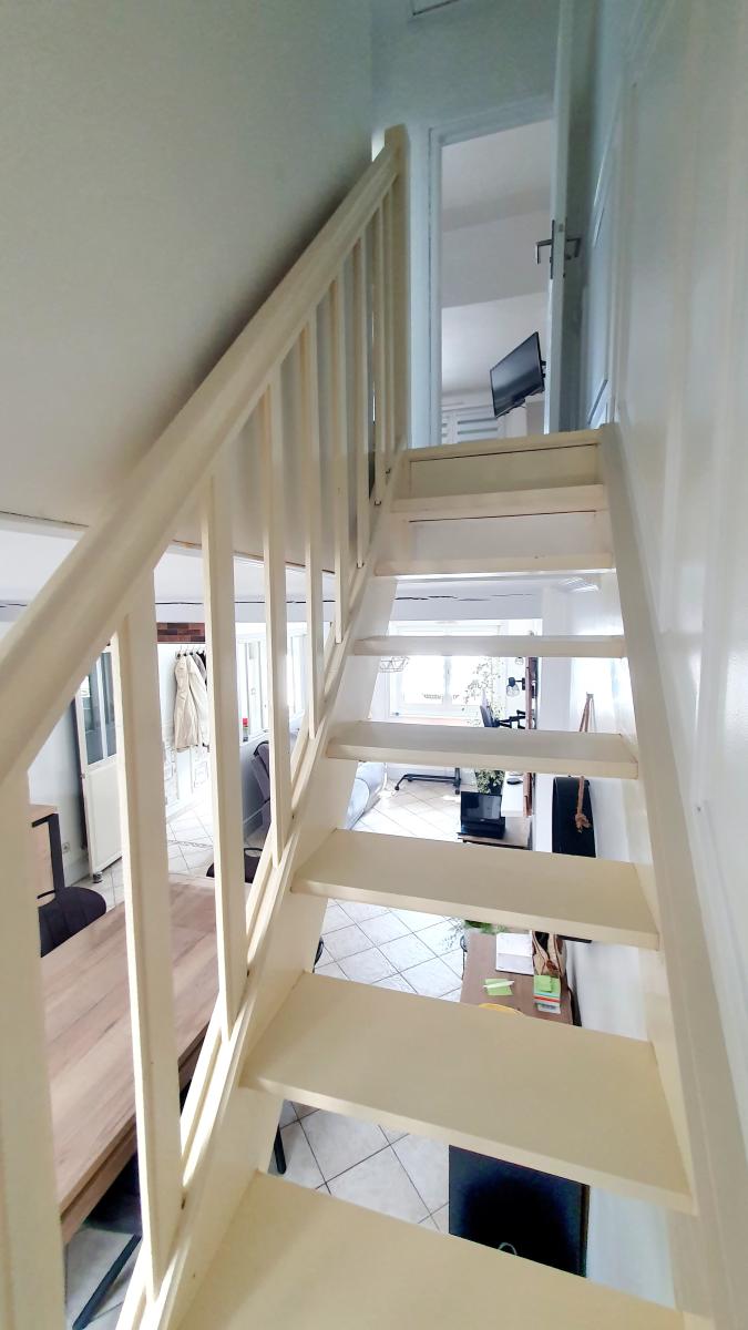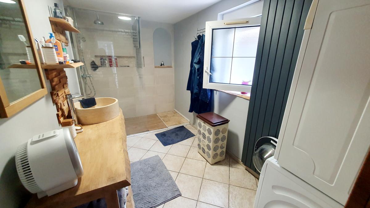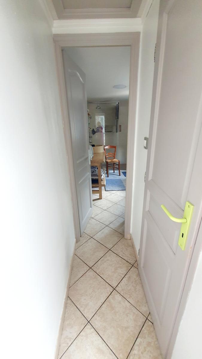 Hall entrée, séjour avec poêle à bois, cuisine aménagée et équipée, couloir, WC ( tout à l'égout), salle d'eau douche italienne et meuble vasque, à l'étage palier et 2 chambres.