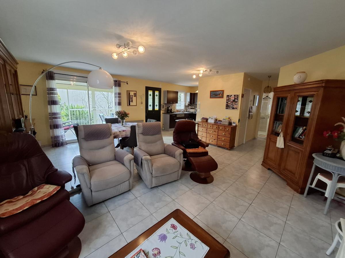 Vous entrez dans une agréable véranda puis une spacieuse pièce de vie de 39 m²avec cuisine équipée, un cellier, un dégagement, 3 chambres, une salle d'eau avec douche à l'italienne, un wc.