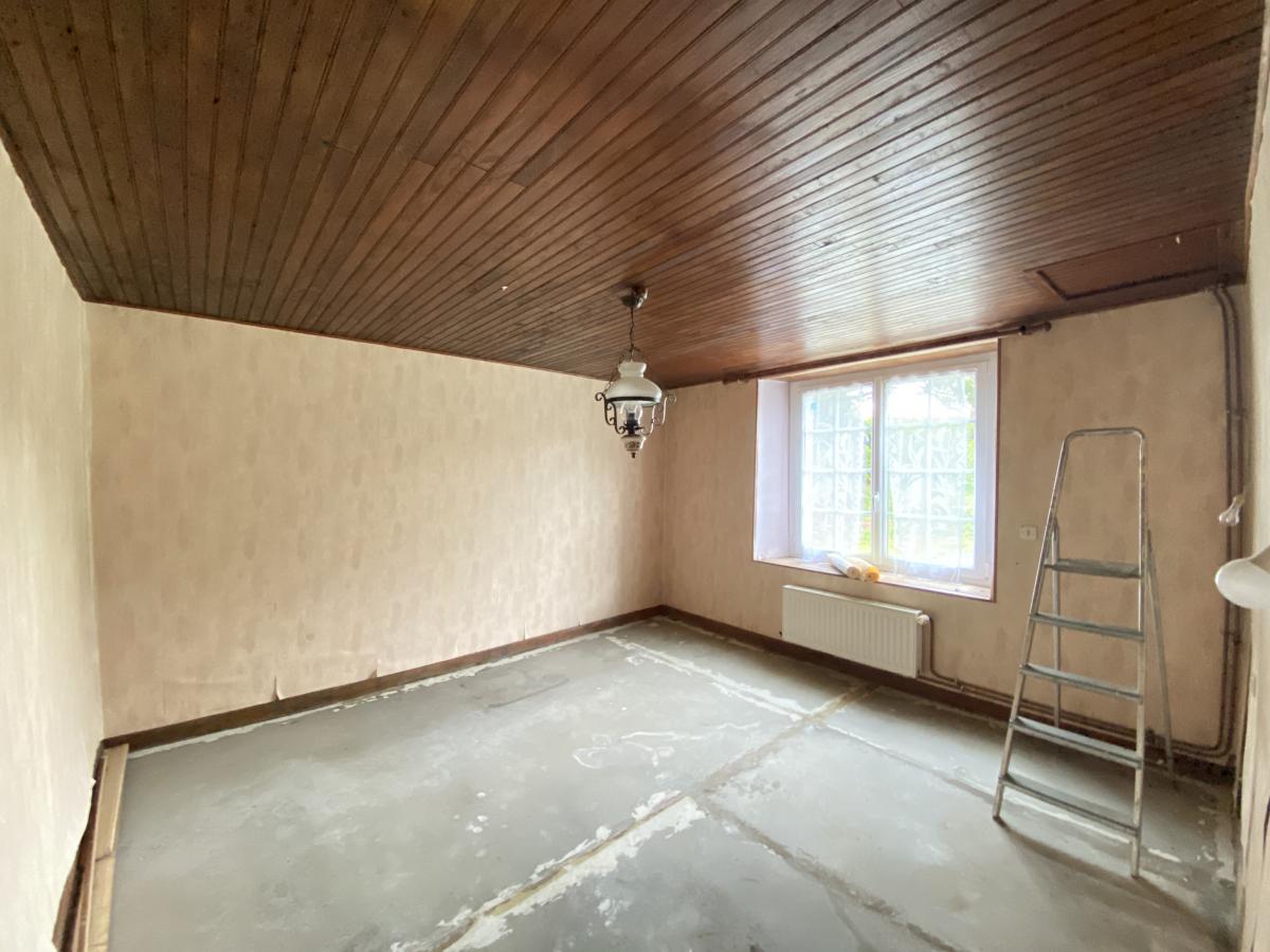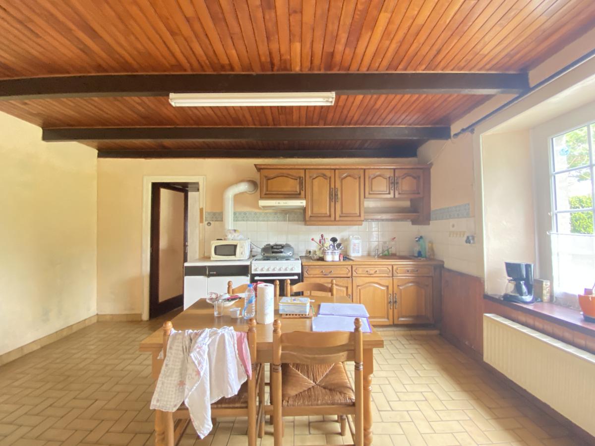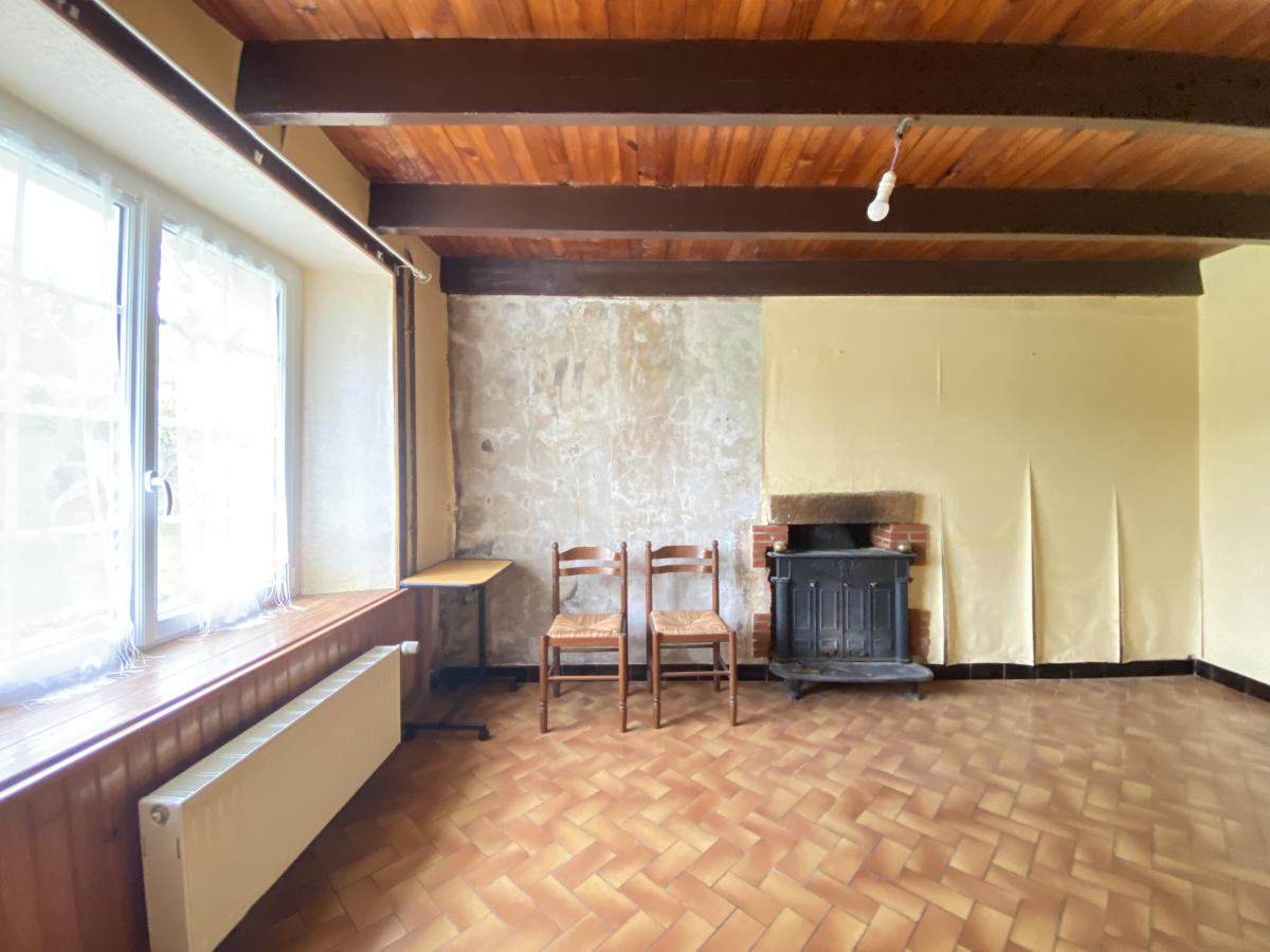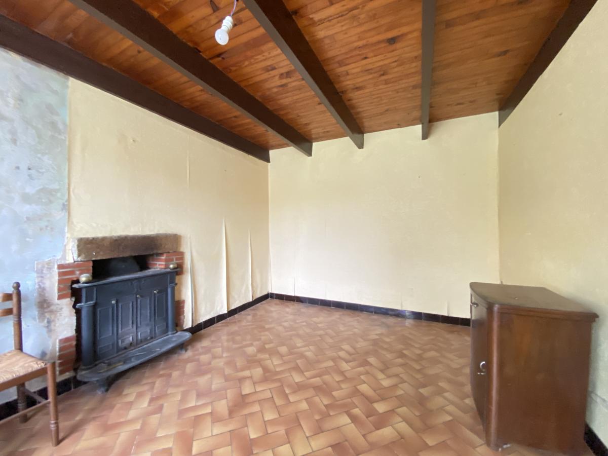 - Au rez-de-chaussée : une entrée, une cuisine, un salon/salle à manger avec insert bois, WC et une chambre.