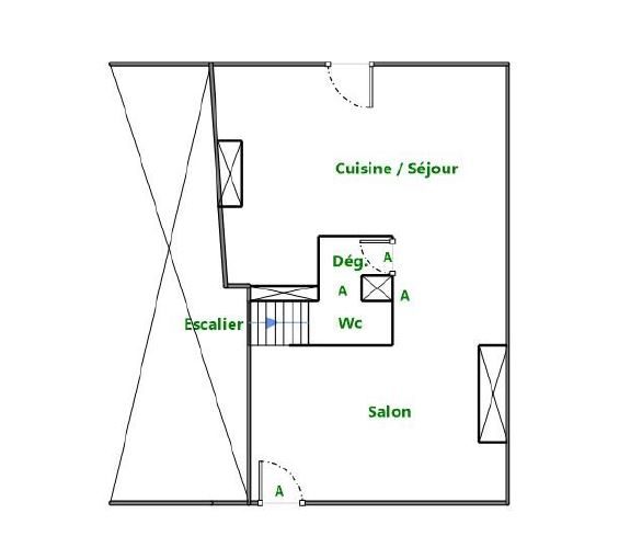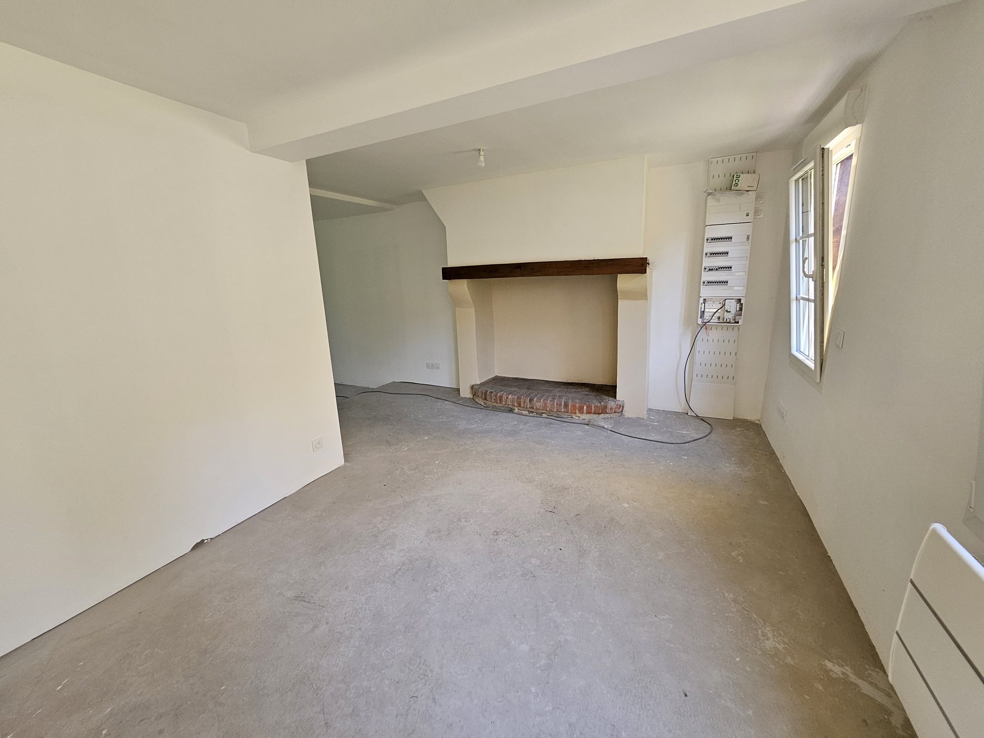 Au rez-de-chaussée : un salon- séjour avec cheminée, ouvert sur la cuisine et WC séparés.