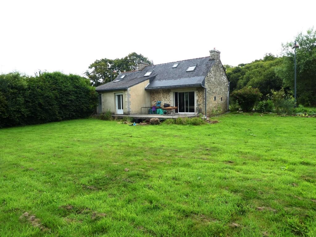 Au bourg et à 6 kms de GUEMENE-SUR-SCORFF et ses commodités; maison en pierres de 3/4 pièces principales. A rafraîchir; elle propose: salon/séjour avec cuisine aménagée ouverte et cheminée (poêle à granules), buanderie, salle d'eau/wc, chambre, cellier; terrasse. A l'étage: pièce palière, wc, chambre. Aussi, une dépendance en bois. Le tout sur un beau terrain, en partie boisé, d'environ 1,71 hectares. EXCLUSIVITE, à venir découvrir...