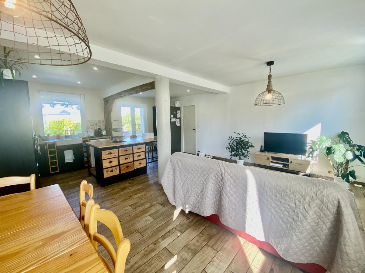 Maison comprenant une entrée, un WC (1 m²), et une cuisine ouverte (13 m²) sur le séjour (30 m²) sur carrelage avec accès au jardin.