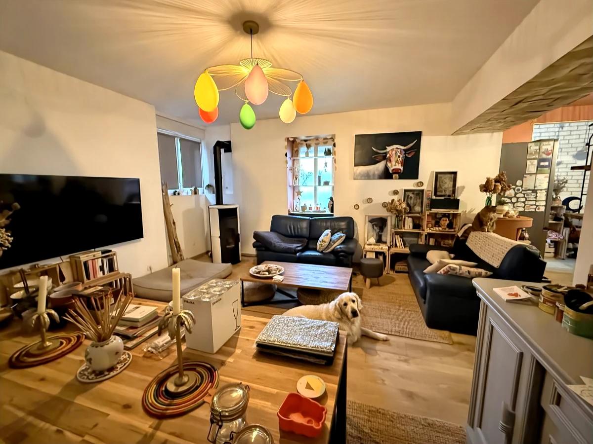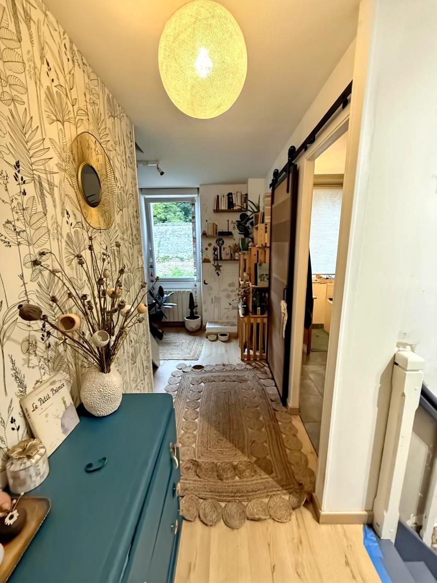 - au RDC : entrée, cuisine A/E ouverte sur salle à manger/salon avec poêle à granulés, wc, débarras sous l'escalier, buanderie,