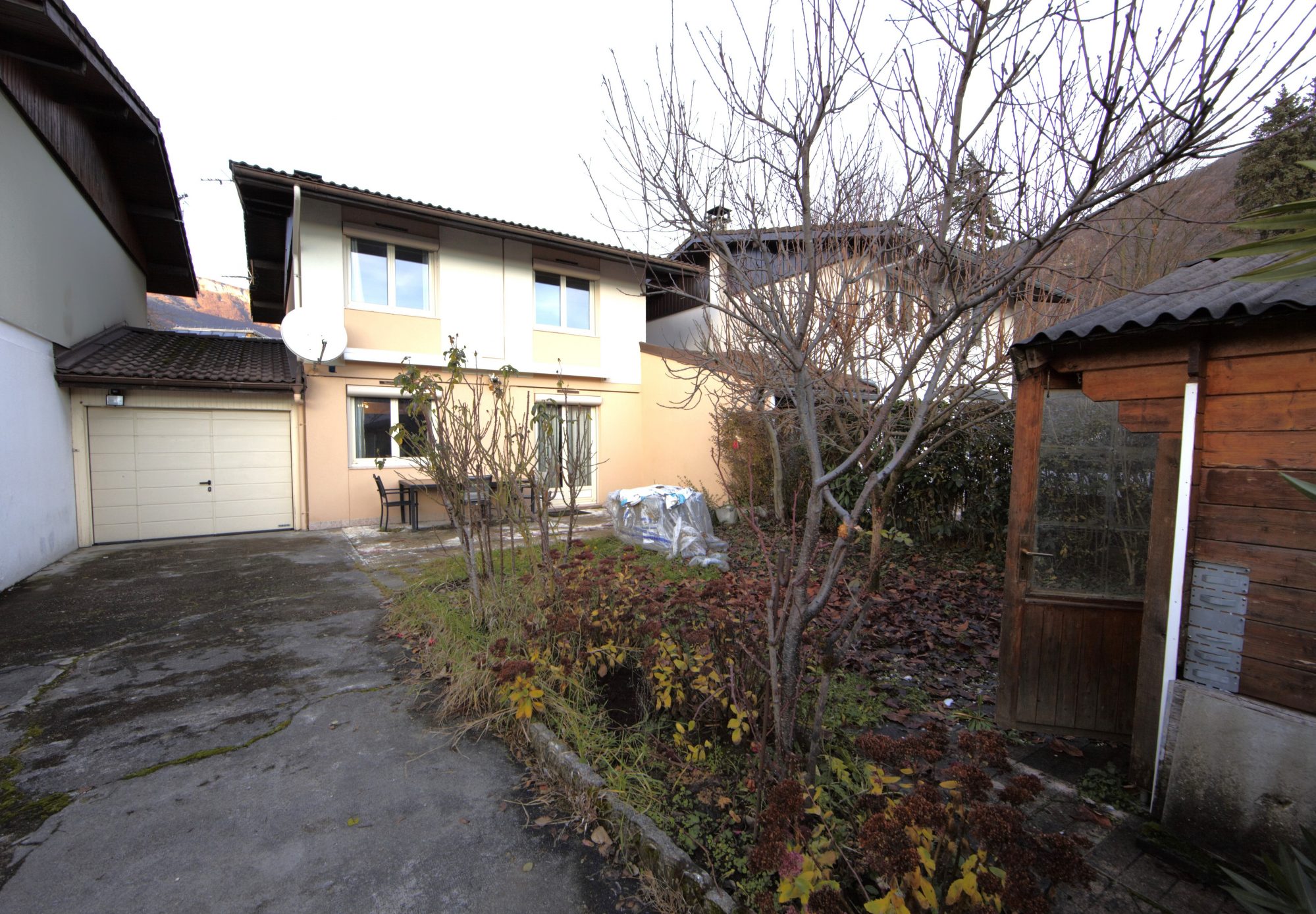 En annexe, un garage avec porte sectionnelle motorisée et un abri de jardin.