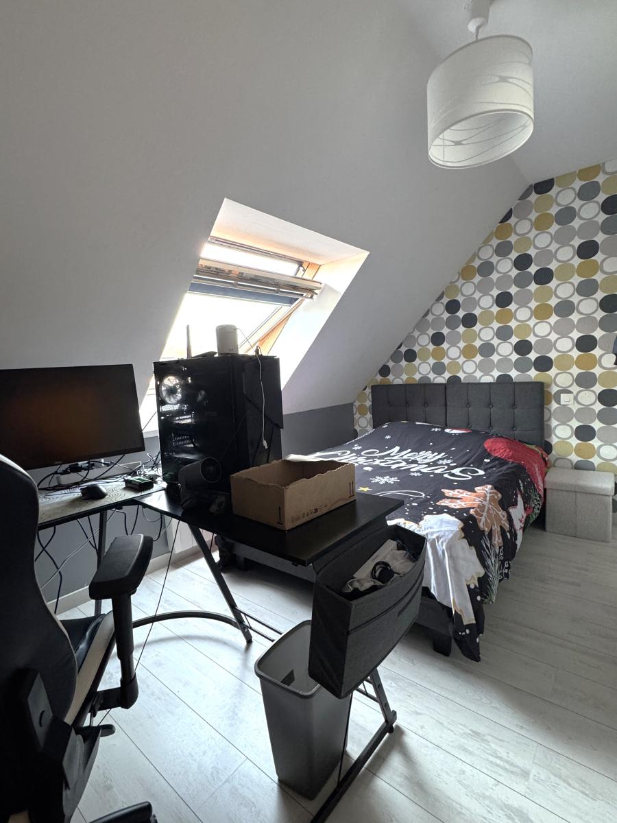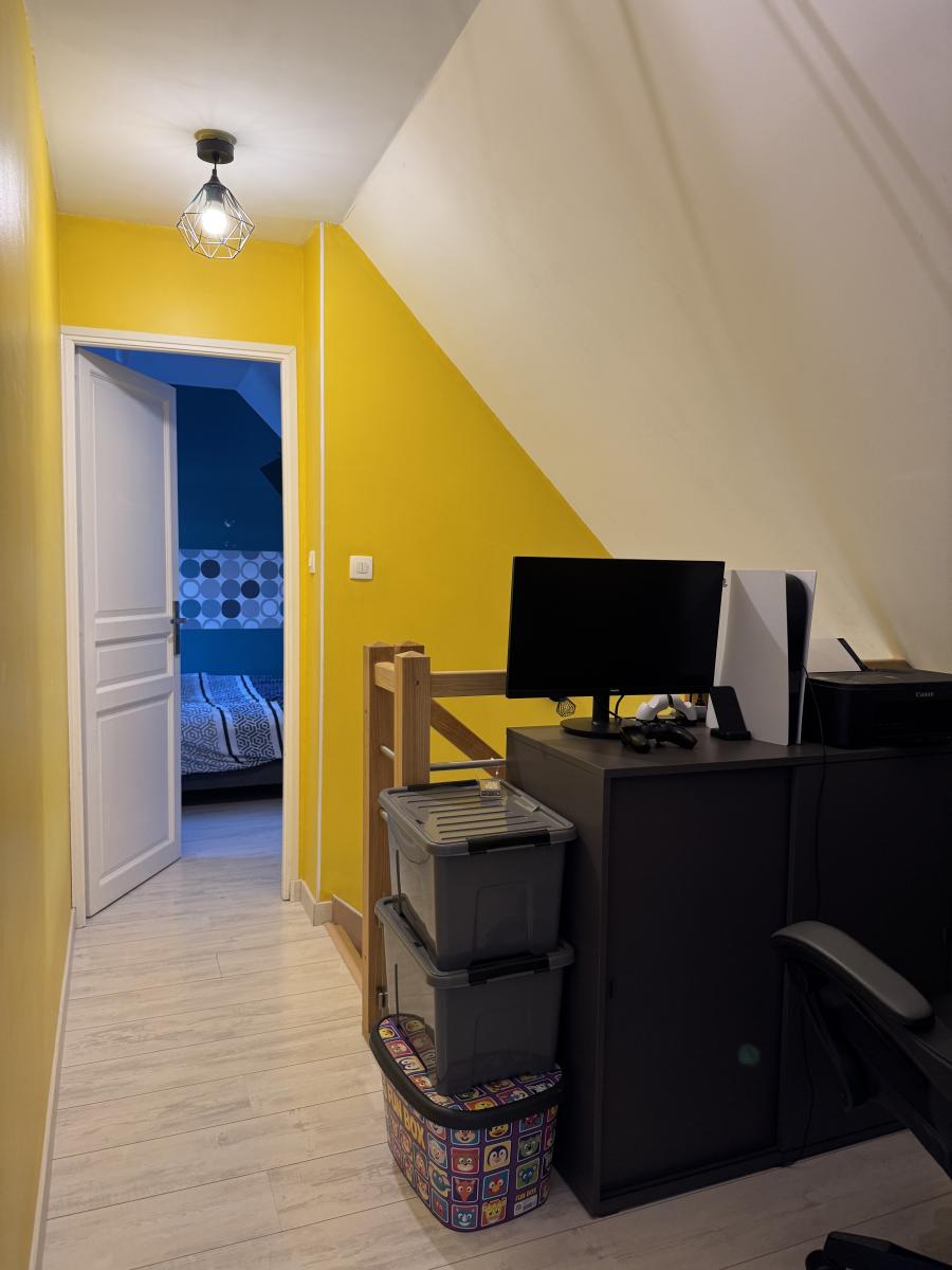 A l'étage : palier/bureau, trois chambres mansardées avec rangements,