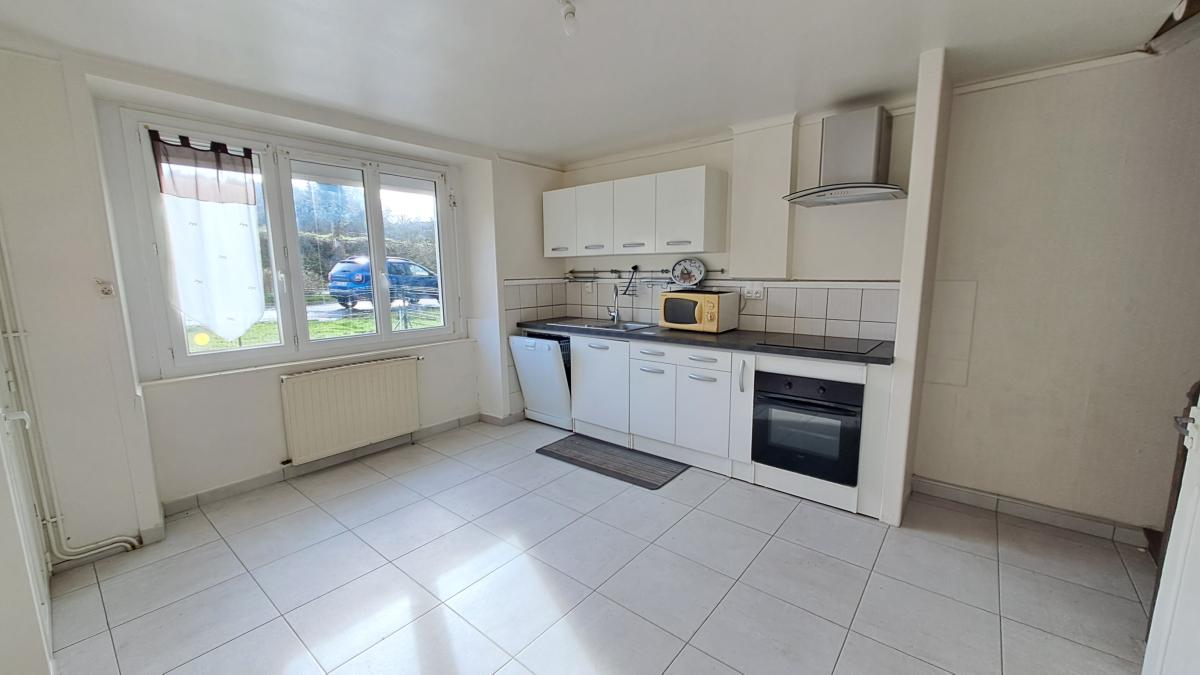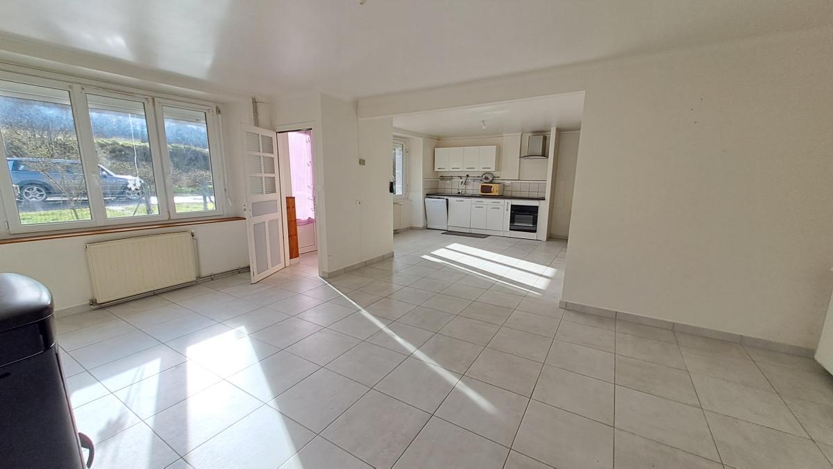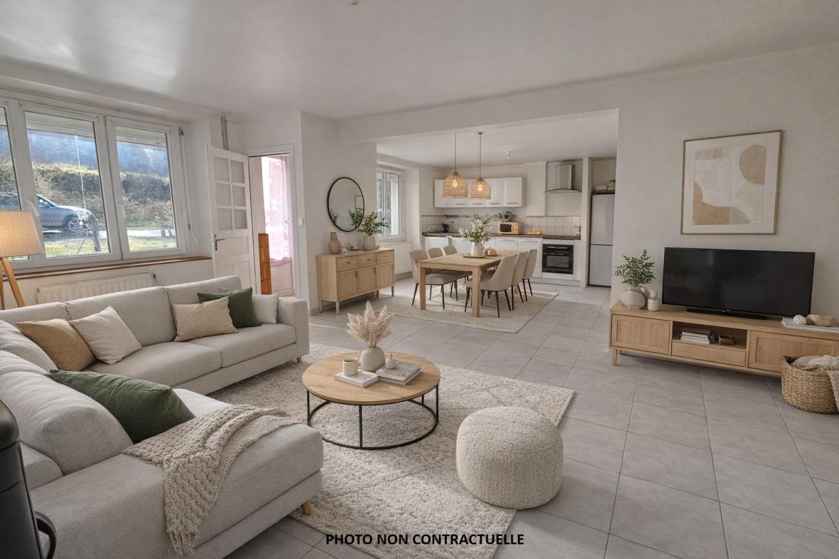 - Au rez-de-chaussée : Une pièce de vie exposée au Sud comprenant une cuisine aménagée et équipée ouverte sur un séjour-salon avec poêle à granulés, cellier, w.c., salle d'eau, chaufferie, garage, préau.