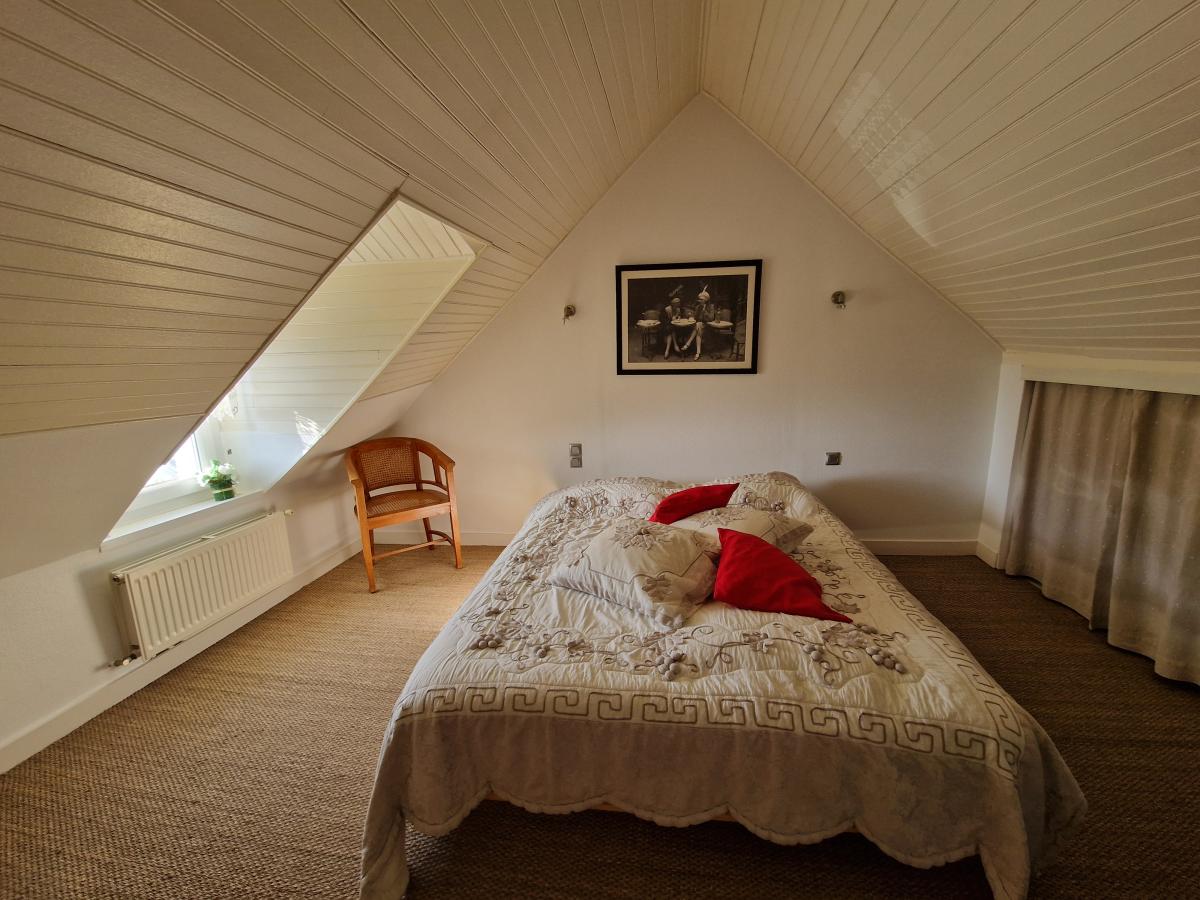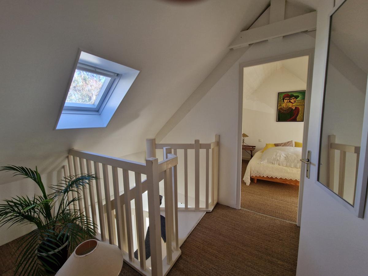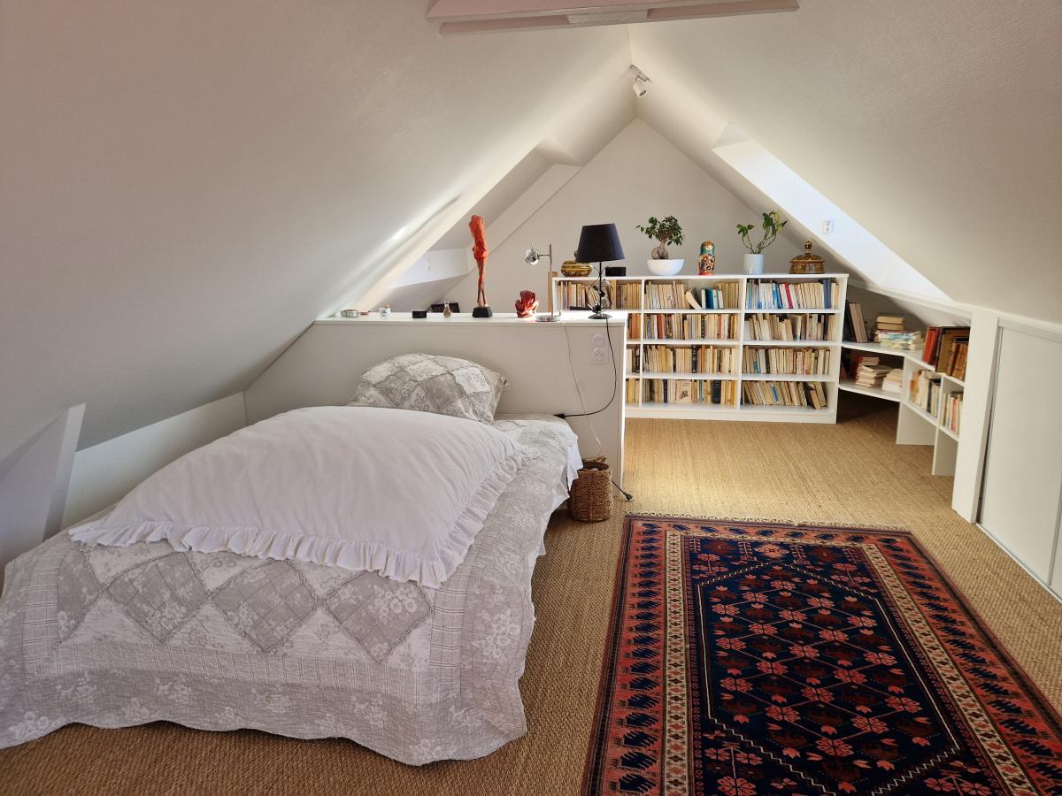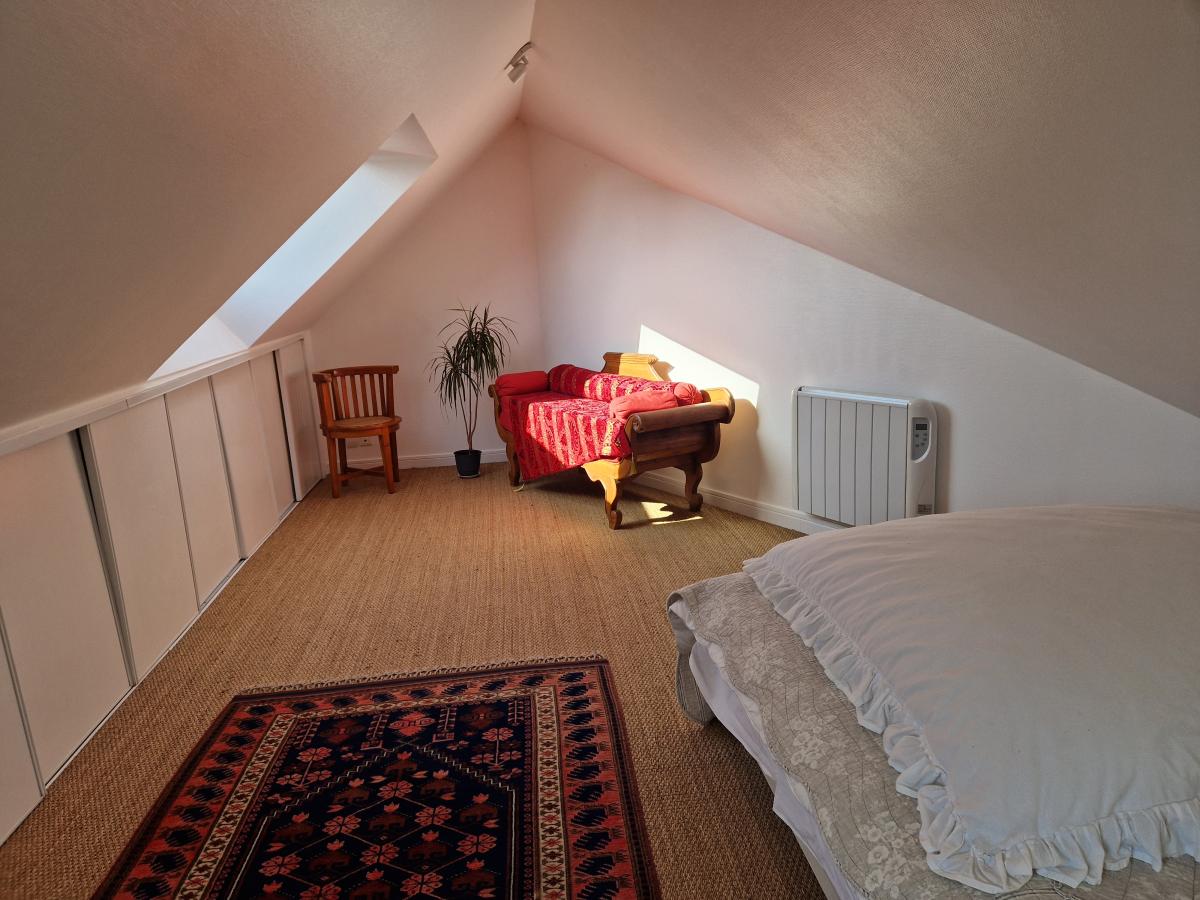 - rez-de-chaussée : cuisine aménagée et équipée ouverte séjour séjour-salon avec cheminée et insert, dégagement avec coin buanderie, salle d'eau-wc, couloir, dressing avec à une partie de l'étage composé d'une chambre mansardée avec coin bureau et nombreux rangements,