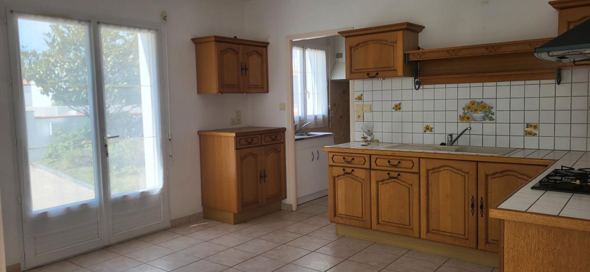 Soullans, quartier prisé et proche commerces, maison comprenant un salon-séjour, une cuisine aménagée et équipée ouverte, une arrière-cuisine, un dégagement, deux chambres (possible 3), une salle d'eau, un wc. Garage attenant avec portail motorisé, garage indépendant avec faux grenier. Puits. Parcelle de 565m² avec deux accès véhicules. classement énergétique C !