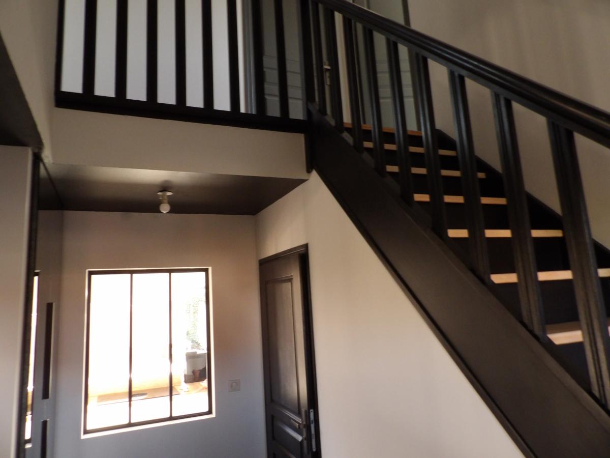 Cette maison dispose au rez-de-chaussée d'un hall d'entrée avec placards de rangements, une cuisine équipée et aménagée avec espace repas ouverte sur un salon-séjour lumineux et un cellier.