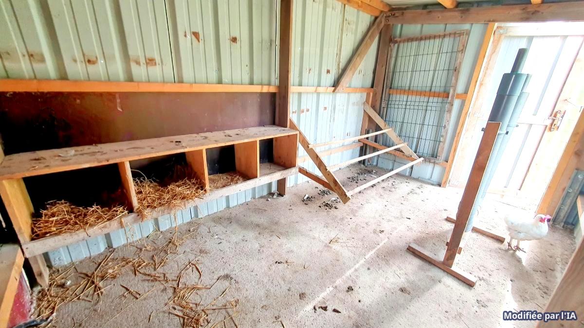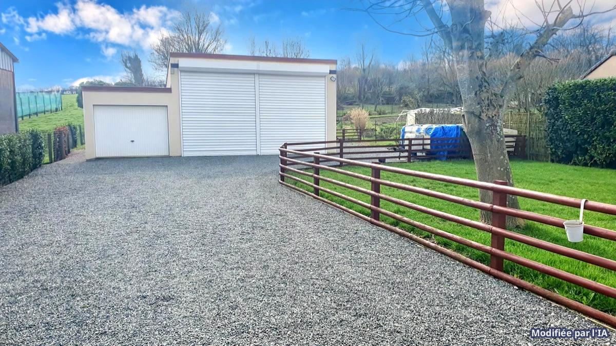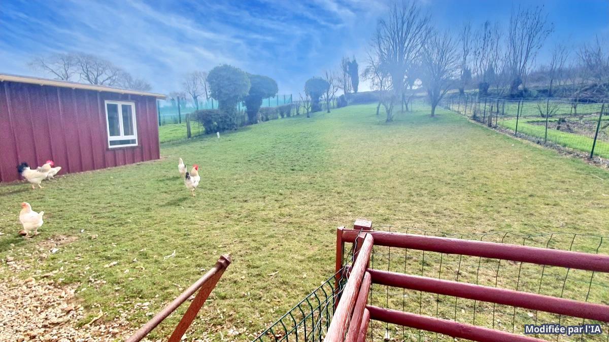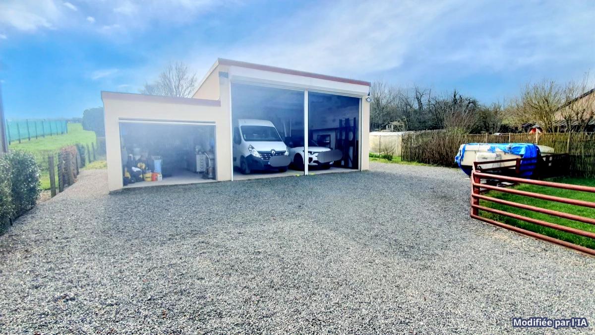 extérieur terrasse carrelée plein sud couverte par une pergola, dépendances 25m2 accolées à la terrasse, parking pour plusieurs véhicules, garage 20 m2, hangar de 45 m2 avec portes motorisées, poulailler,