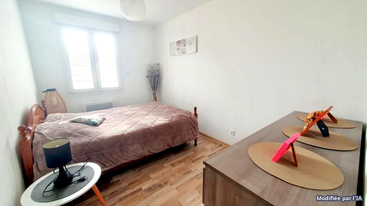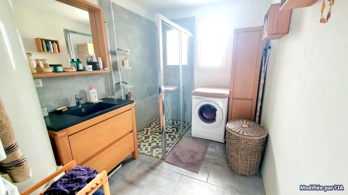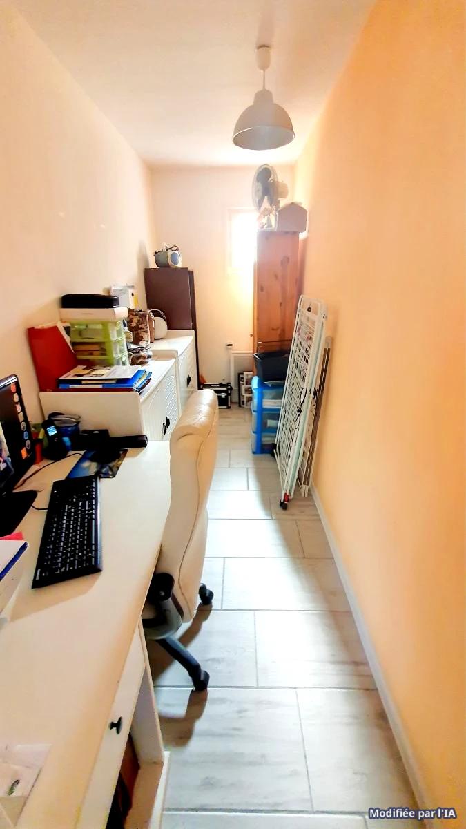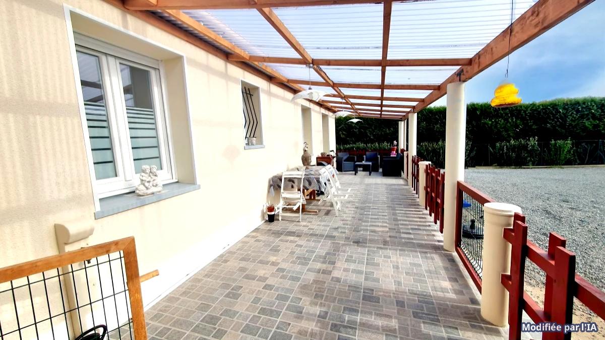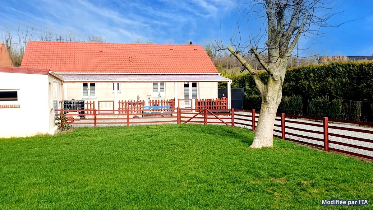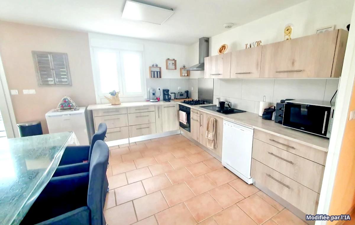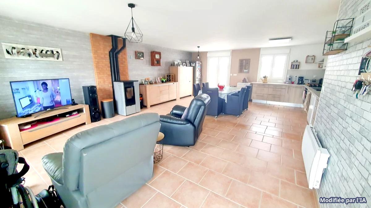 maison indépendante de plain pied rénovée en 2021 comprenant séjour avec poele à pelés, cuisine aménagée ouverte, couloir, wc, salle d'eau douche italienne, 3 chambres, 1 bureau, cellier,