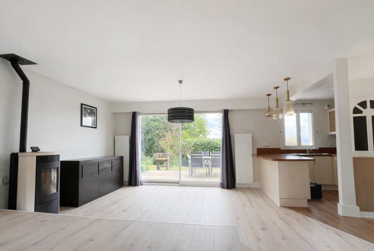 Édifiée sur une belle parcelle close, cette maison séduit par son exposition plein sud et sa vue dégagée sur la nature, véritable atout au quotidien. Le rez-de-chaussée offre une entrée avec placard, une cuisine ouverte sur un séjour lumineux prolongé par une baie vitrée donnant accès à une terrasse bois et au jardin, ainsi qu’un salon/séjour chaleureux équipé d’un poêle à granulés. Un espace nuit complète ce niveau avec une chambre, une salle de bains et un WC indépendant. Un cellier/buanderie permet un accès direct au garage attenant.