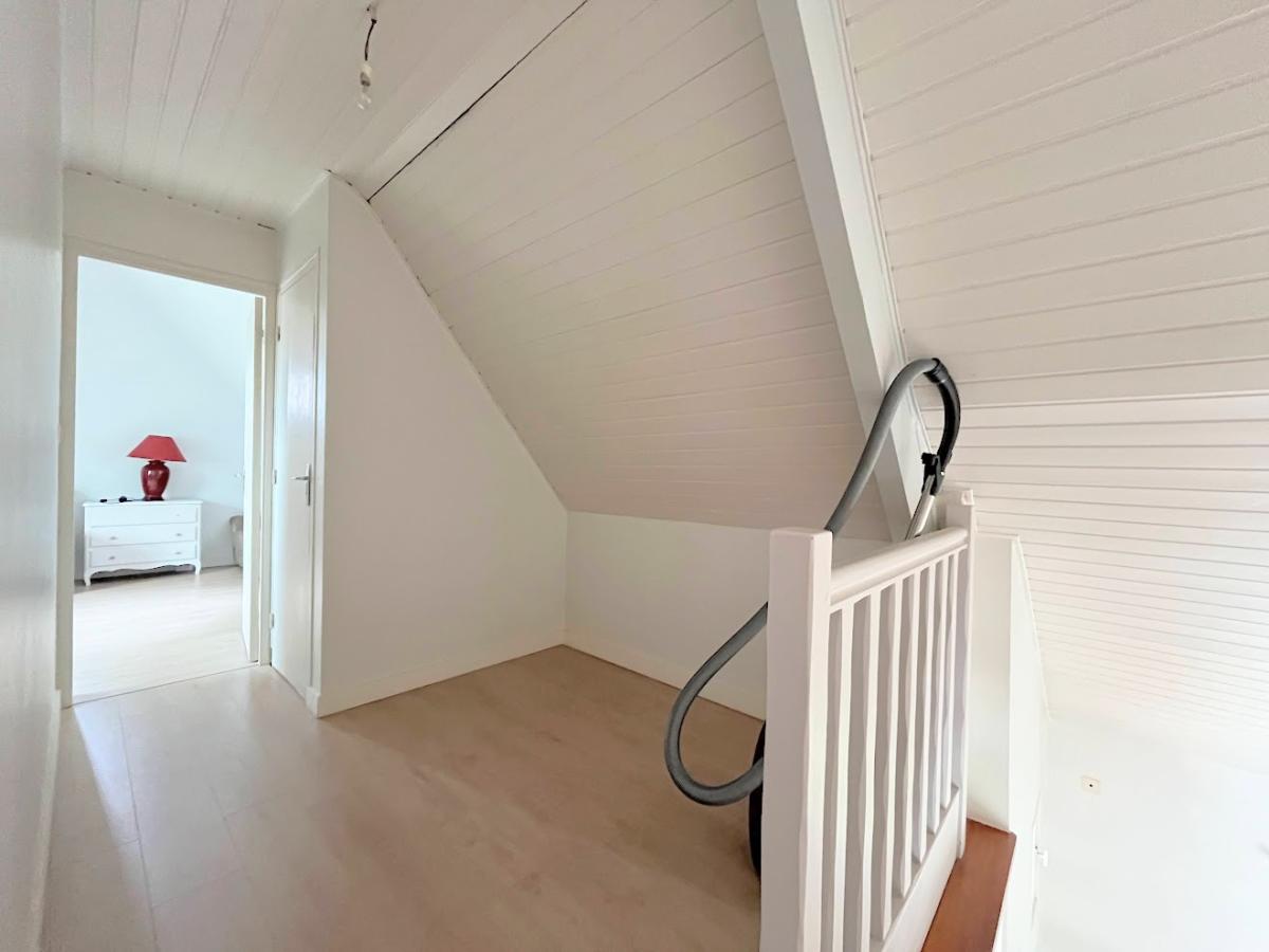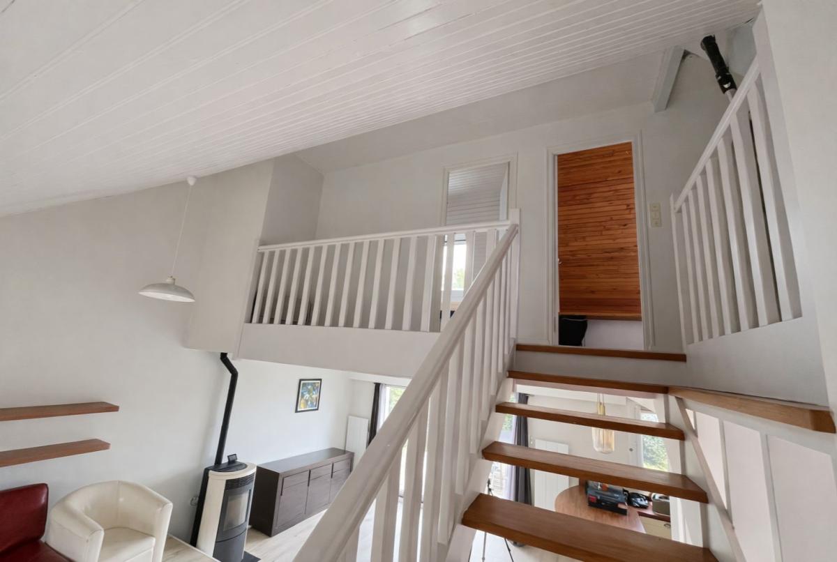 À l’étage, sur dalle béton et accessible par un escalier bois, le palier dessert trois chambres supplémentaires ainsi qu’un WC indépendant, offrant un espace fonctionnel pour accueillir famille et amis.