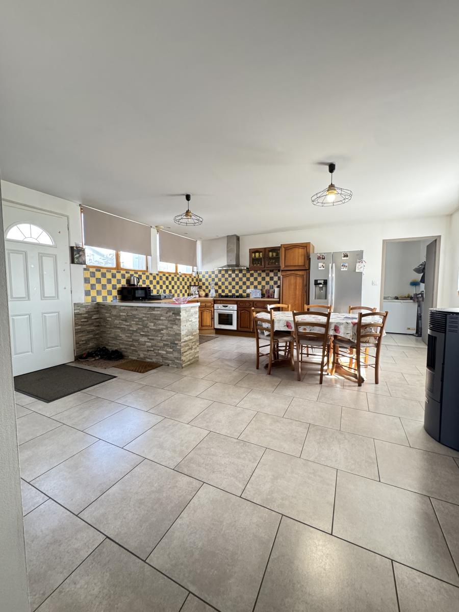 Le bien se compose de cinq pièces principales, comprenant un espace de vie, une cuisine, plusieurs chambres, une salle d’eau ainsi que deux cabinets d’aisances. Le système de chauffage est assuré par un poêle à granulés complété par des radiateurs. Les menuiseries extérieures sont en double vitrage.