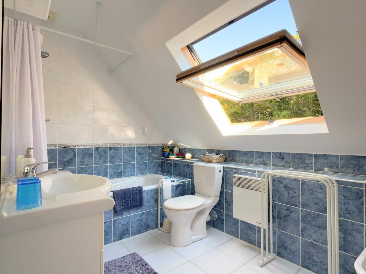 À l’étage, un palier dessert trois chambres confortables et une salle de bains avec WC.