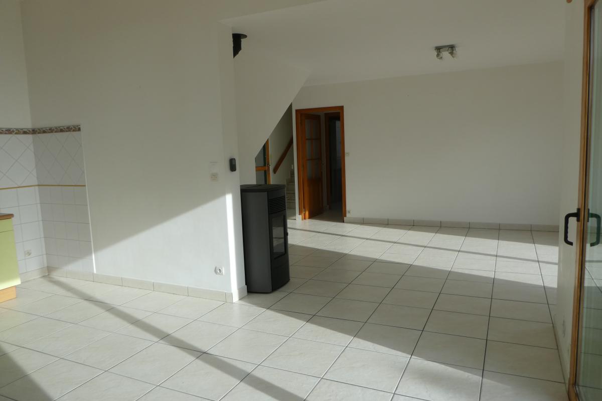 Rez de chaussée : entrée sur pièce de vie avec cuisine aménagée et poêle à pellets, baies vitrées sur terrasse au sud, chambre, salle d'eau avec WC