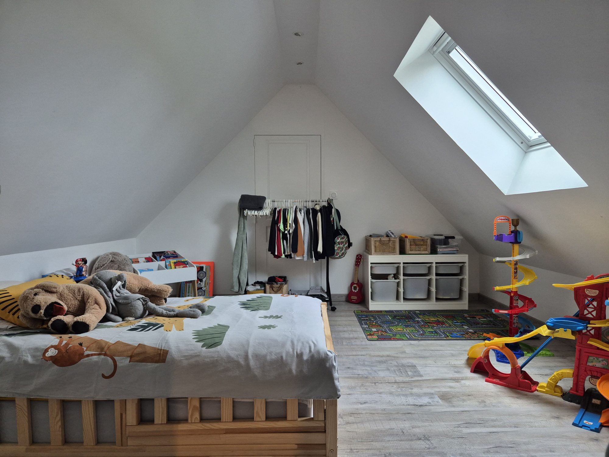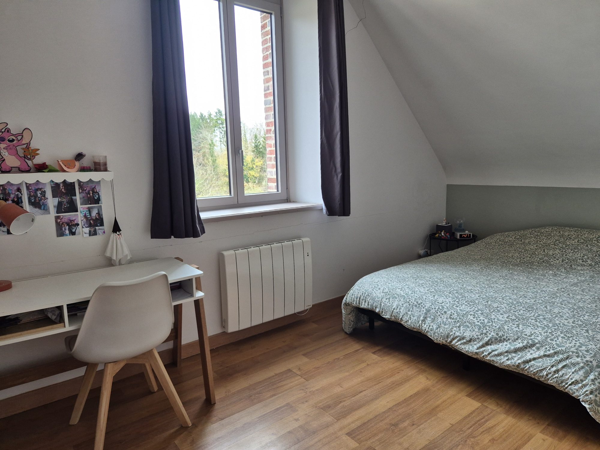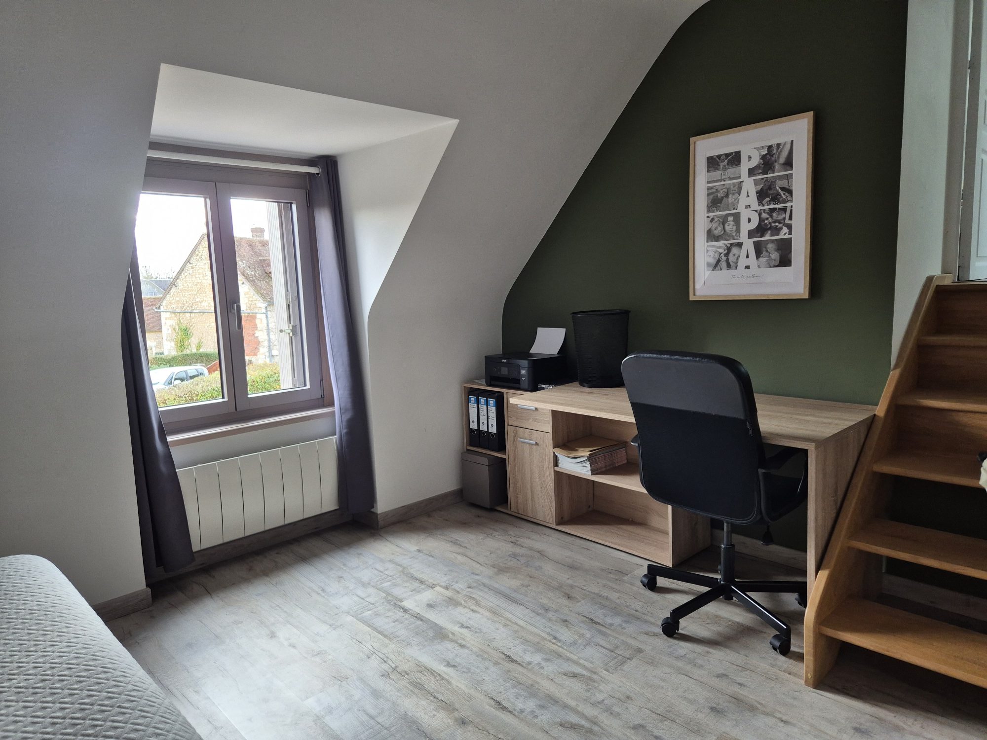 À l’étage, le palier distribue un WC, une chambre, un bureau, une chambre d’enfant et un grenier.