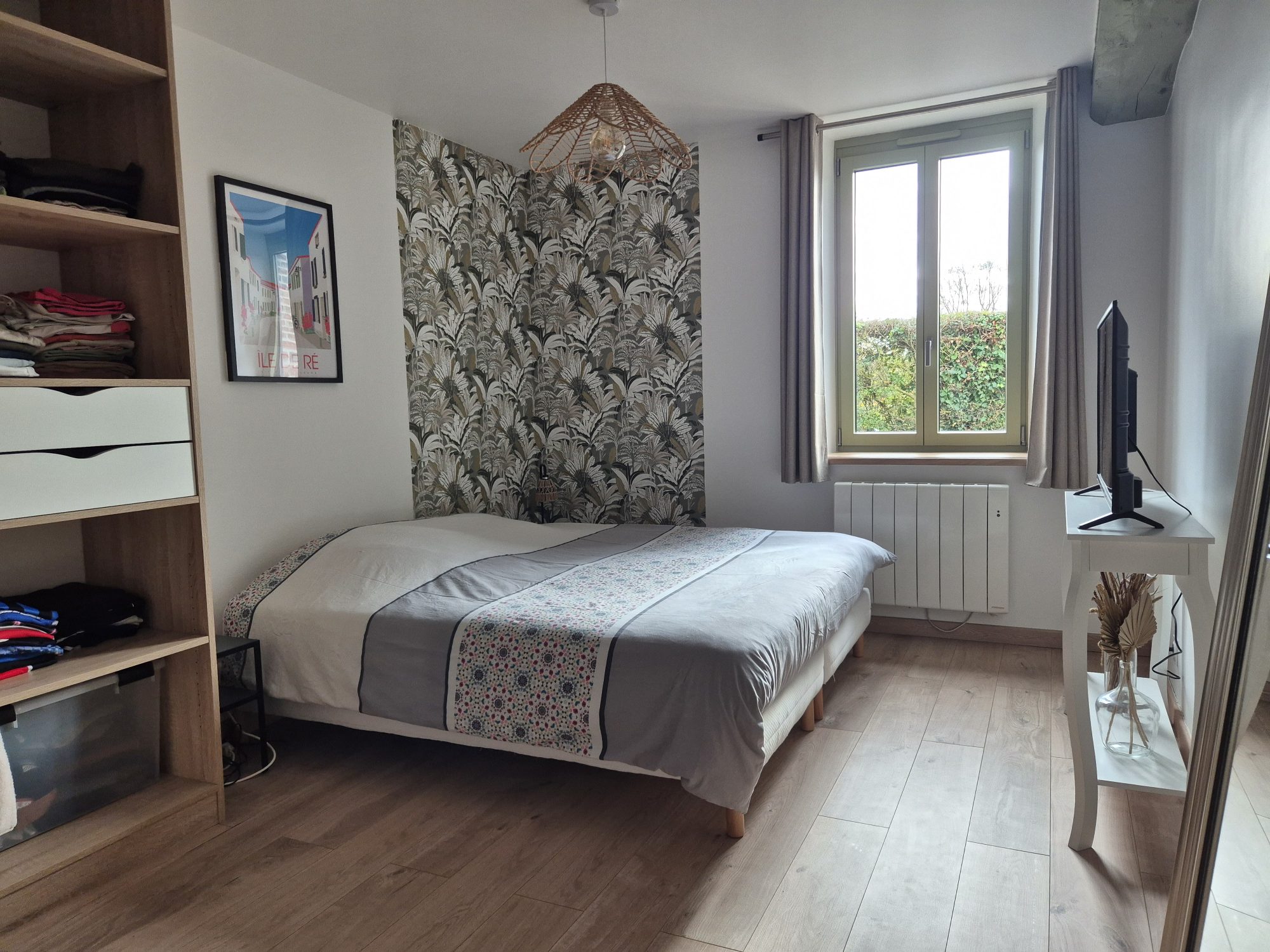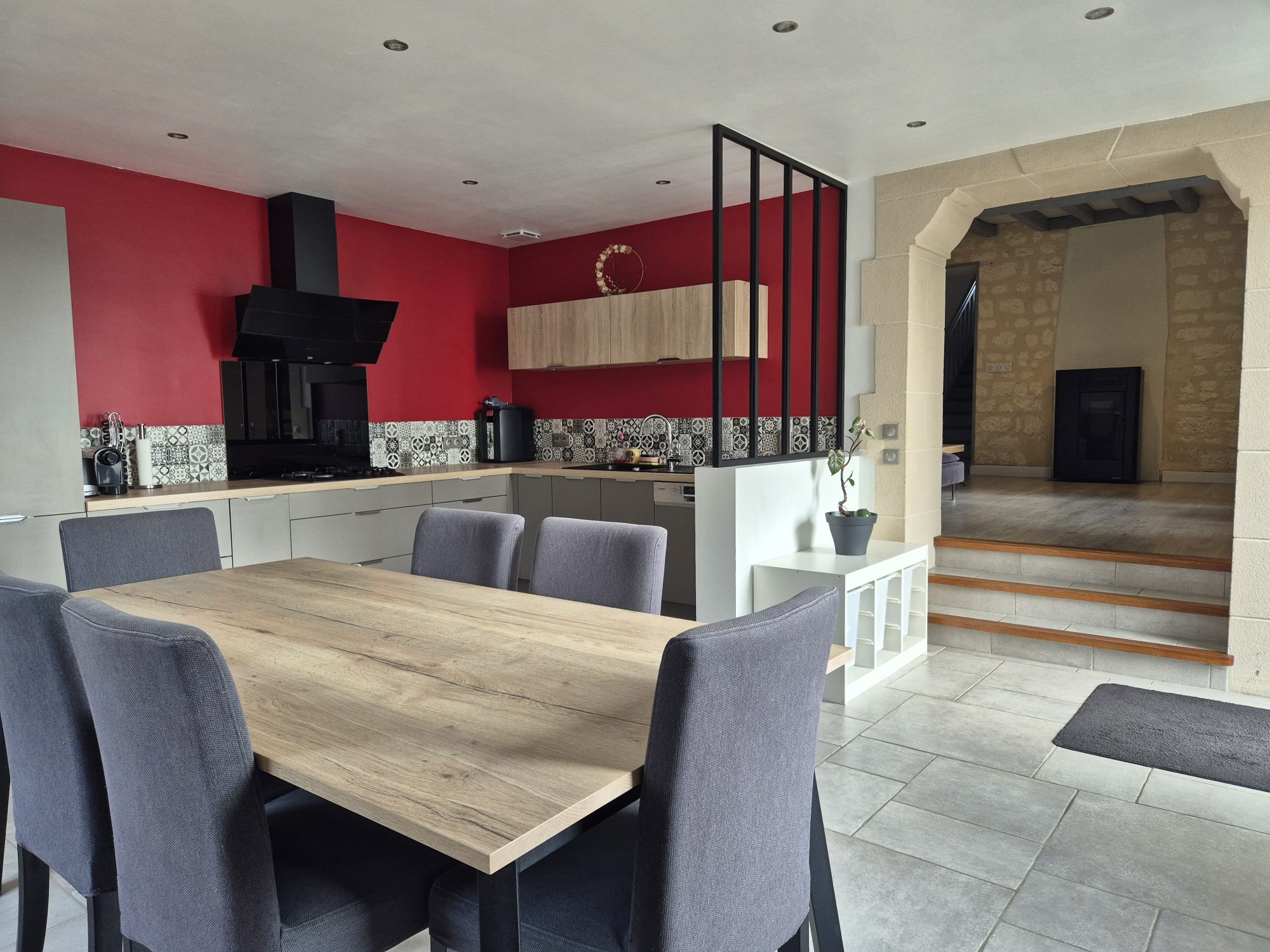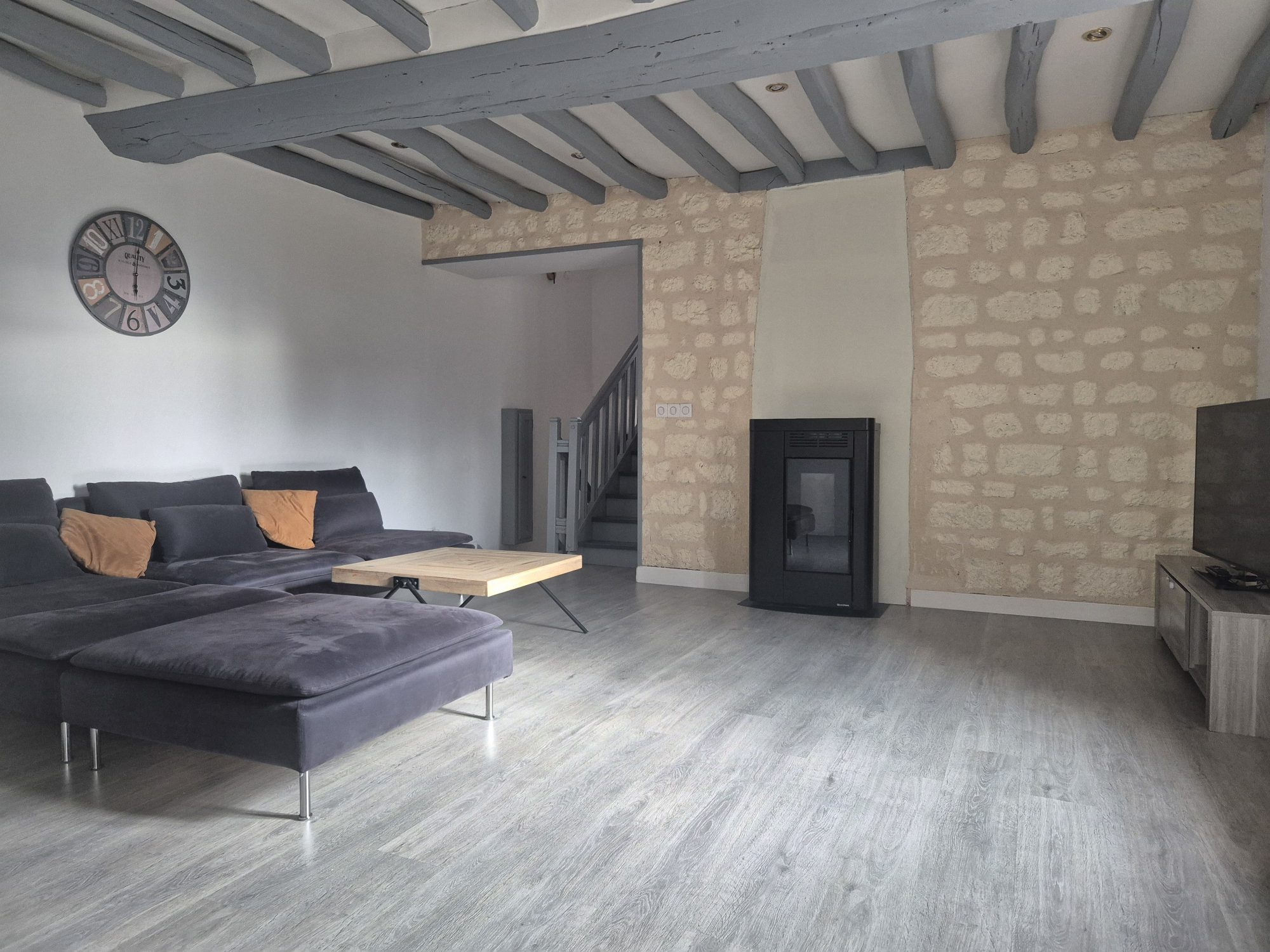 Elle se compose au rez-de-chaussée : d’une cuisine dinatoire aménagée et équipée, ouverte sur un salon agrémenté d’un poêle à granulés, ainsi que d’une chambre, d’une salle d’eau et d’un WC.