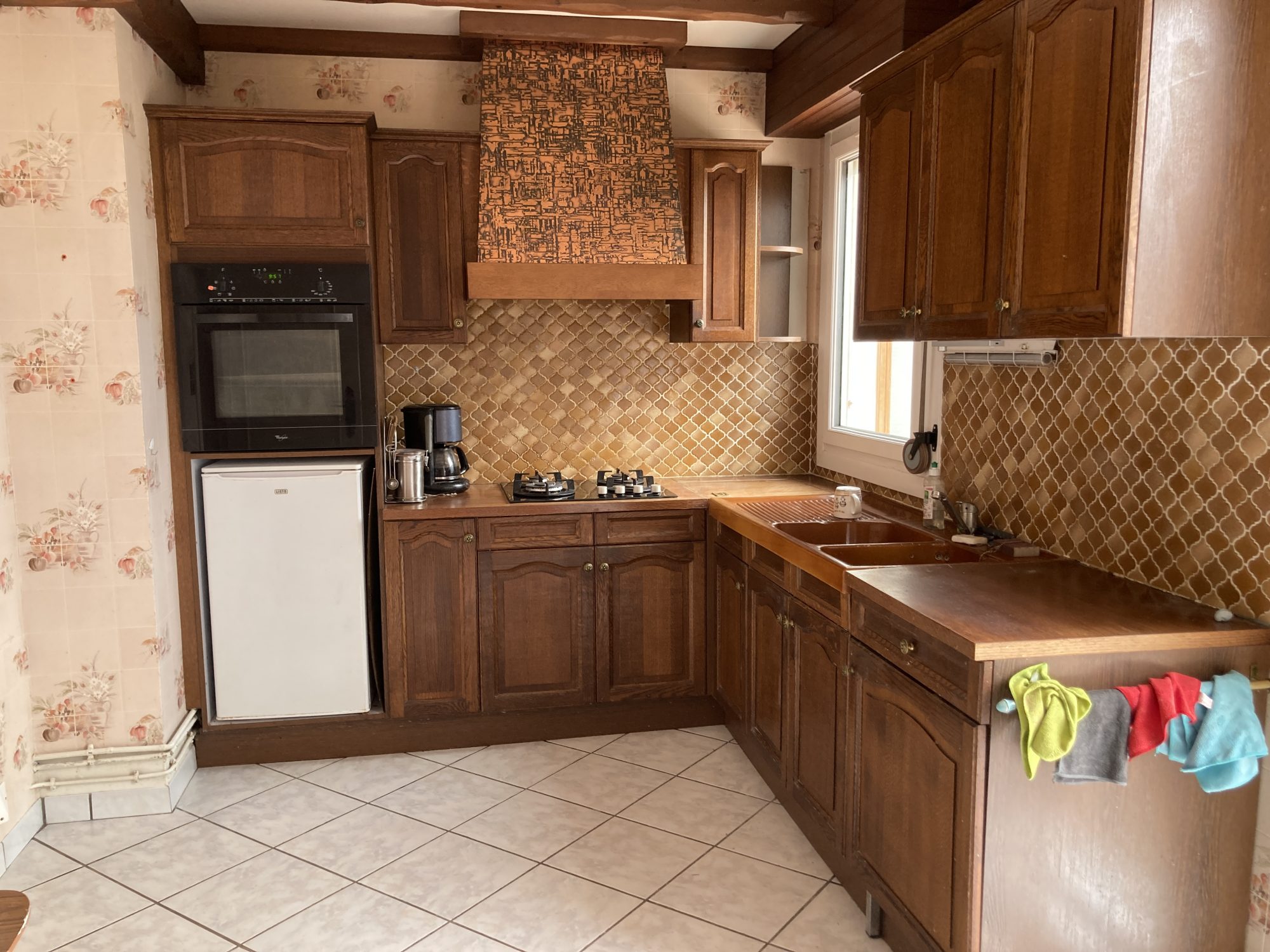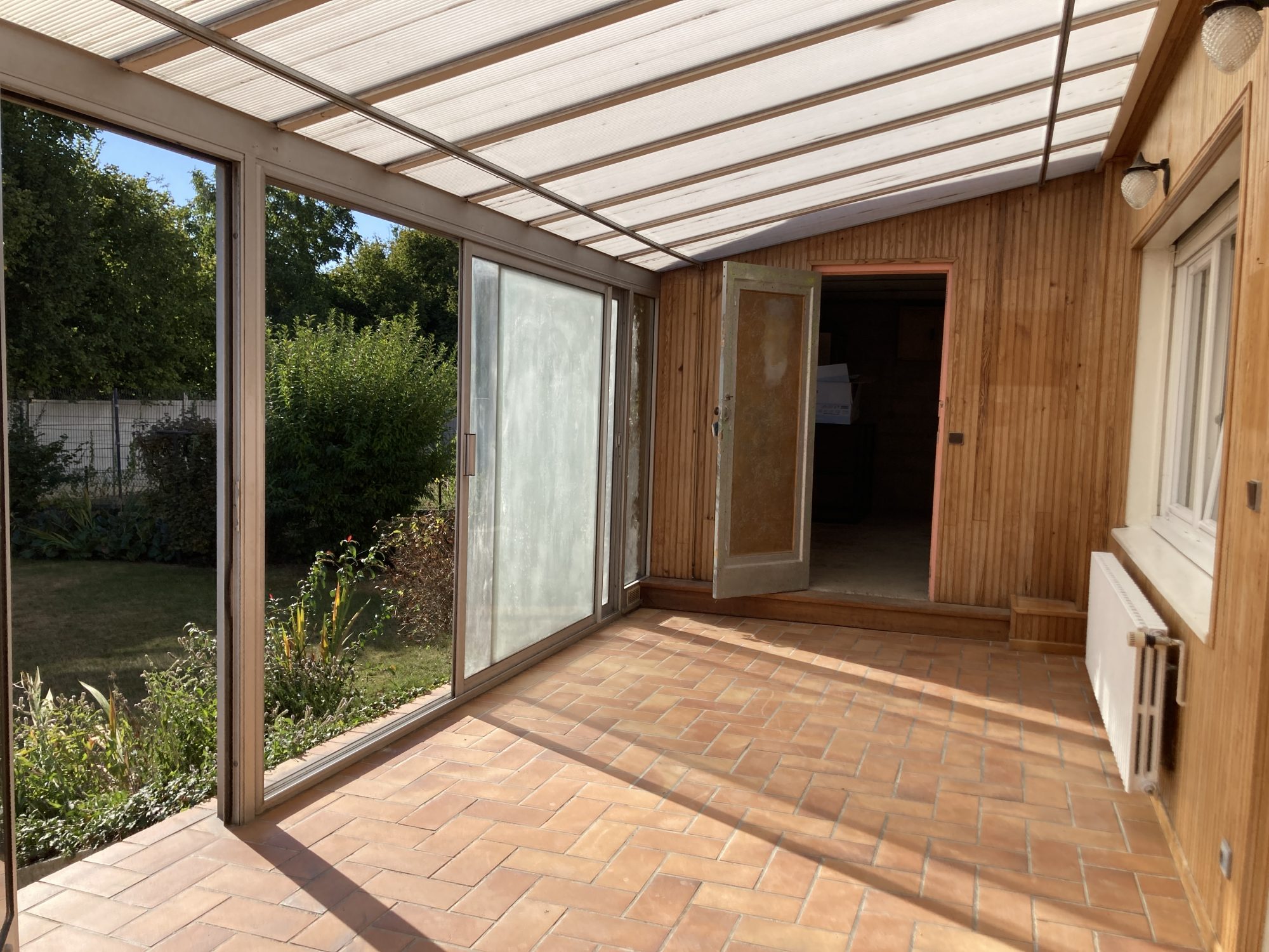 Au rez-de-chaussée : entrée, wc, rangement, cuisine équipée bois, séjour salon avec insert et grande véranda chauffée.