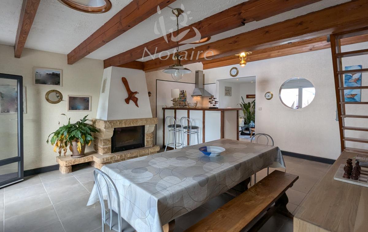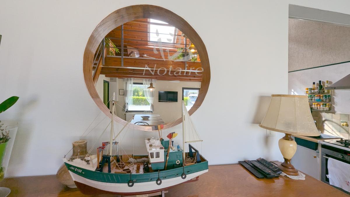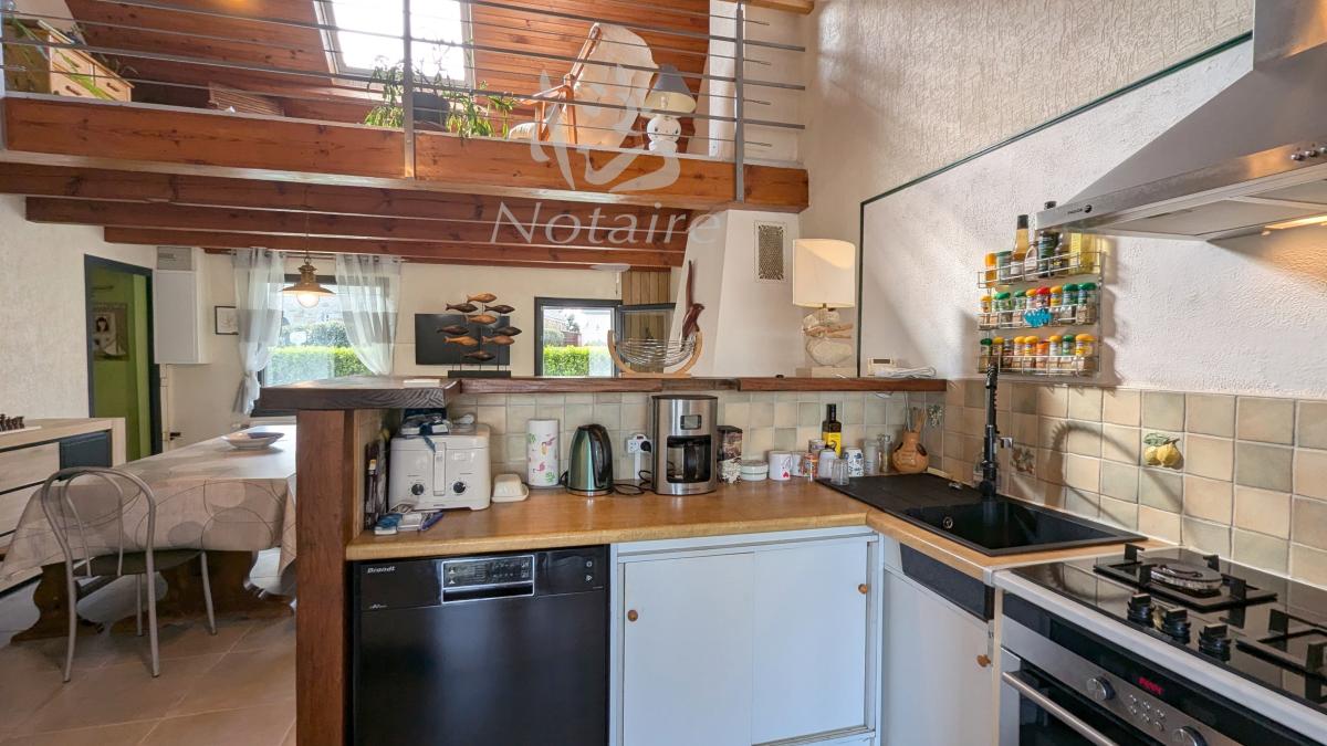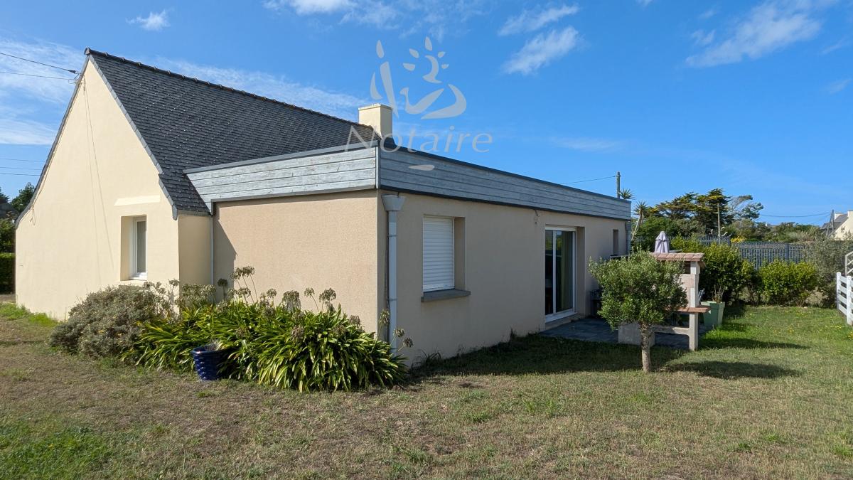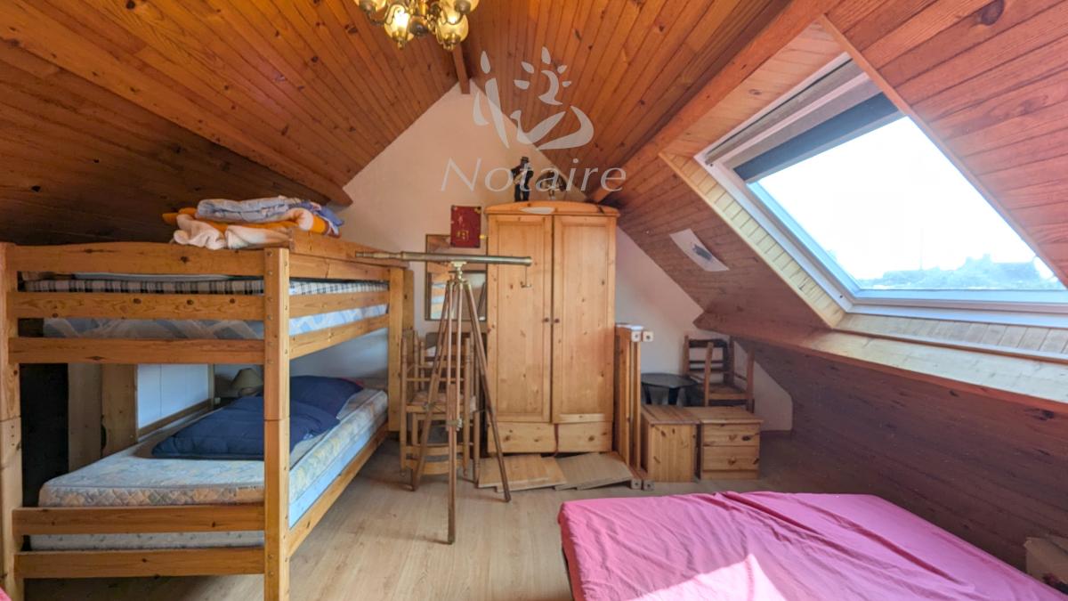 À seulement 200 m des plages de Menfig, cette maison habitable de plain-pied vous séduira par son emplacement privilégié et ses espaces bien agencés. La maison dispose de deux chambres, salle d'eau et WC au rez-de-chaussée, ainsi que d'une belle pièce de vie chaleureuse, agrémentée d'une cheminée avec une cuisine ouverte qui s'intègre harmonieusement à l’espace. Le salon, inondé de lumière grâce à une grande baie vitrée, s'ouvre directement sur une terrasse. Un cellier à usage de chaufferie/buanderie complète ce niveau. À l’étage, une mezzanine parfaite pour un bureau ou un coin détente mène à une troisième chambre bénéficiant d'une petite vue sur la mer. À l'extérieur, cour bitumée avec deux places de stationnement pratiques, jardin clos idéal pour les moments de plein air, chalet de jardin en bois pour vos rangements.