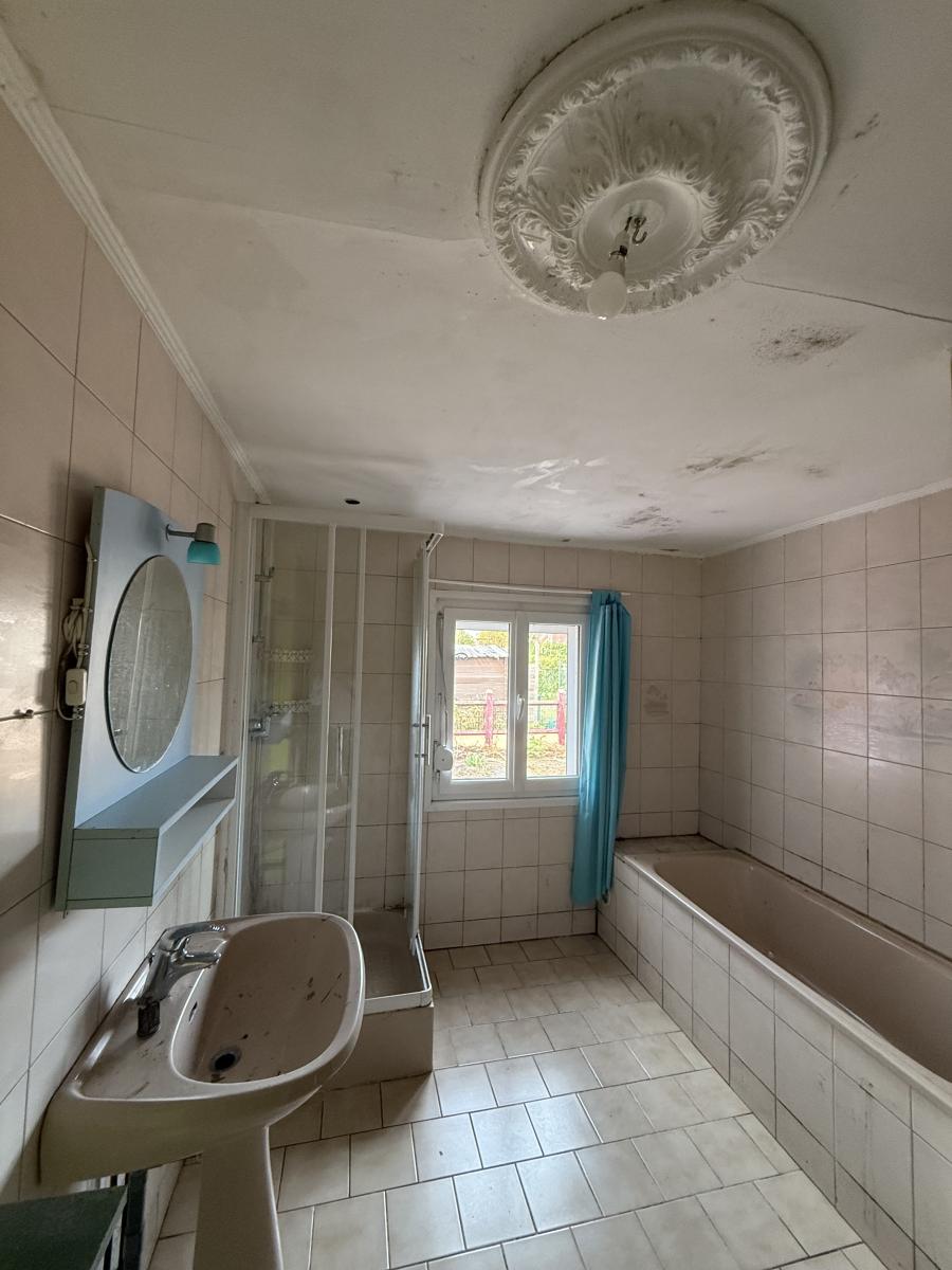 A la suite, salle de bains équipée d'une baignoire, lavabo sur colonne et cabine de douche le tout faïencé.