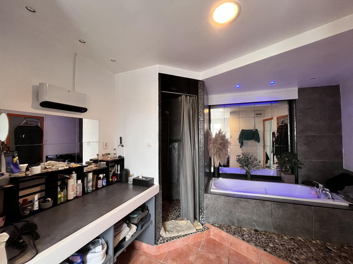 -Au rez-de-chaussée : salle de bain, salon salle à manger de 28m² ouvert sur la cuisine équipée, cellier, wc, une chambre avec dressing et douche.