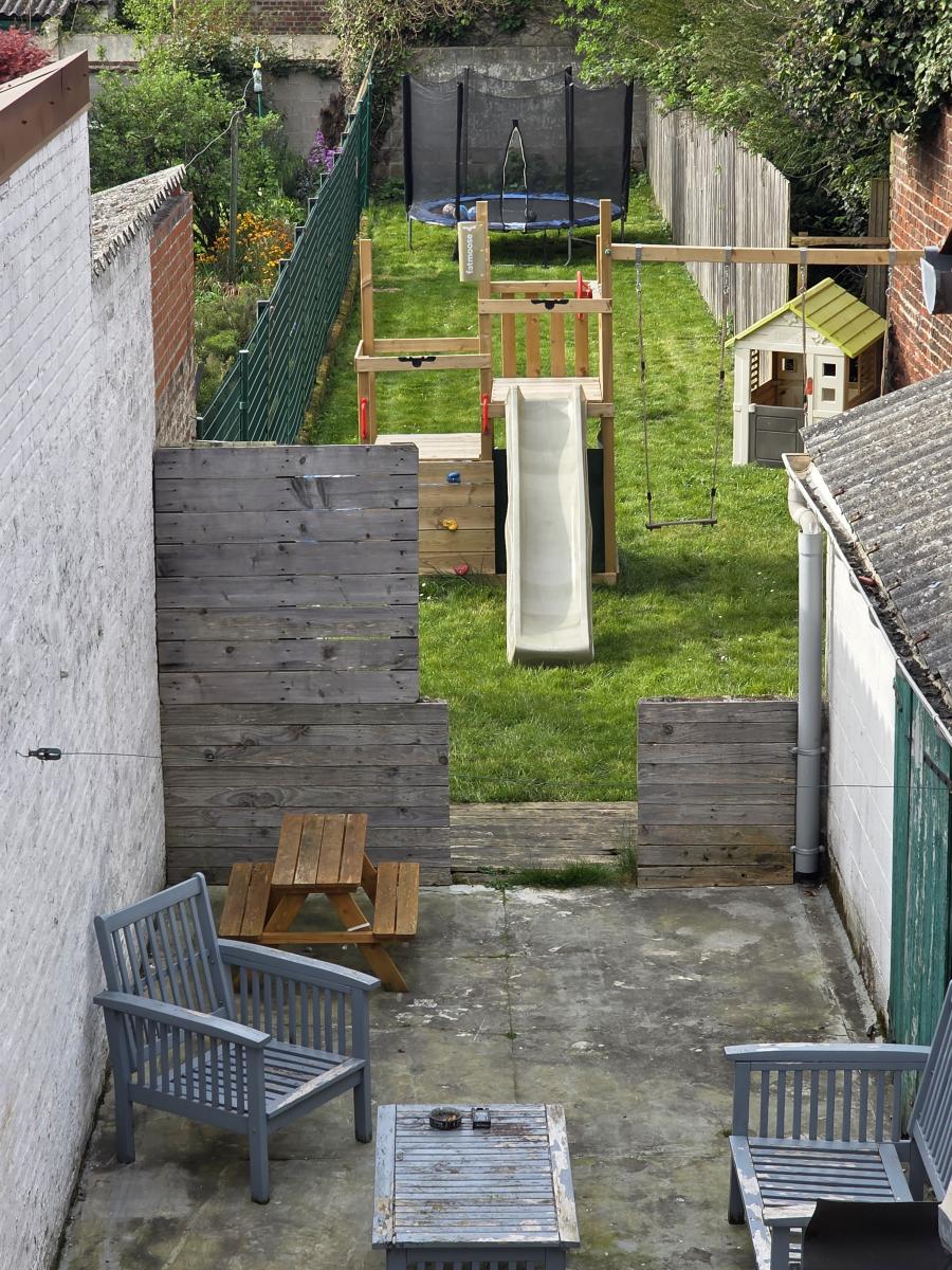À l’extérieur, vous profiterez pleinement des beaux jours grâce à une terrasse, un jardin clos avec gazon en bon état, ainsi qu’une dépendance idéale pour le rangement ou l’aménagement d’un espace détente.