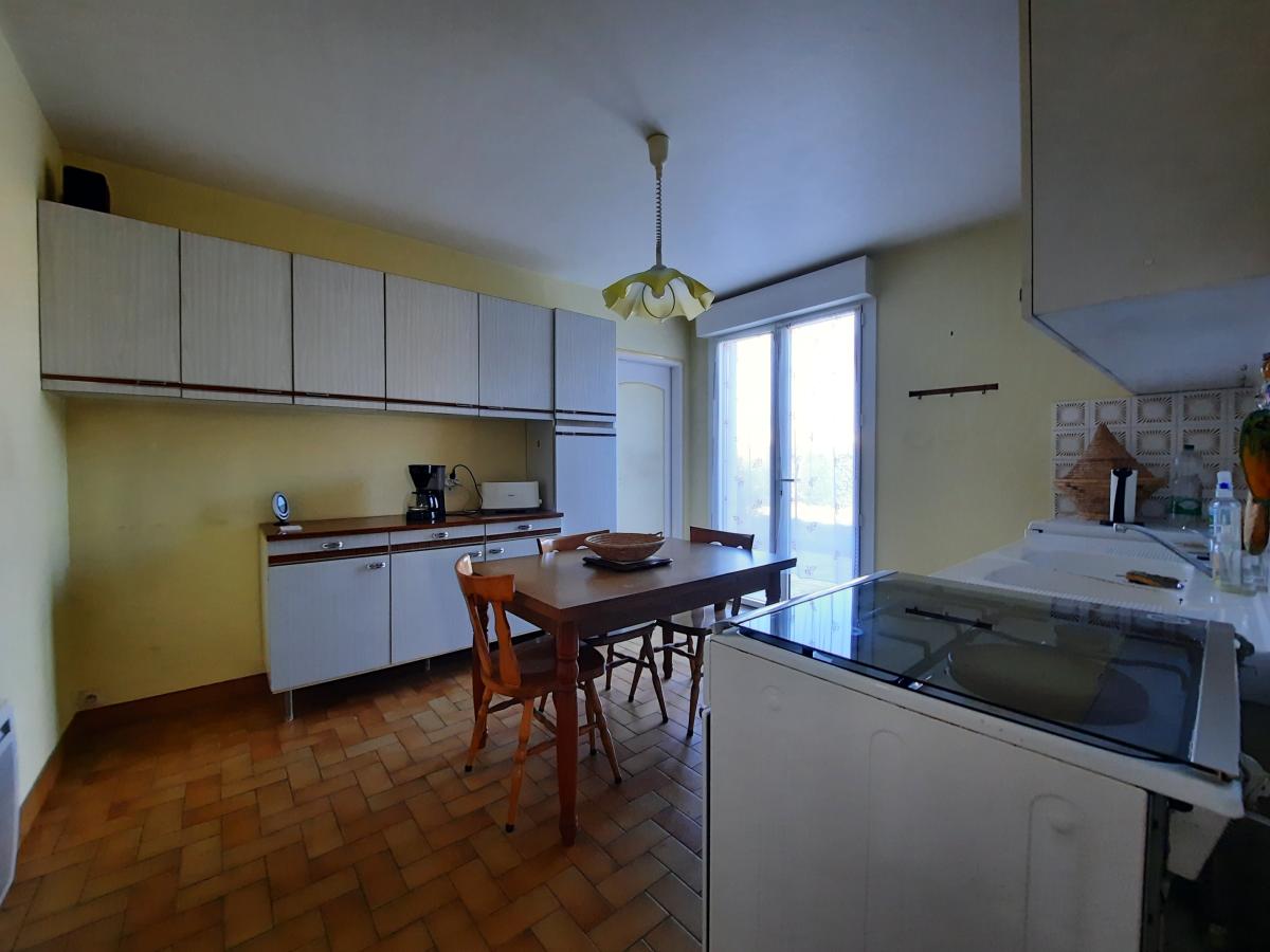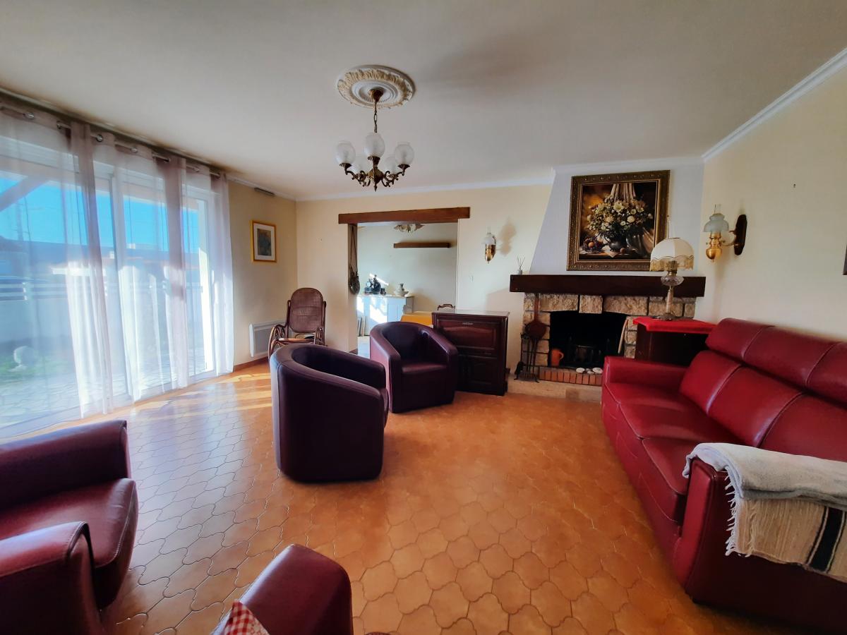 Proche commerces, maison de plain-pied comprenant : une entrée, un salon avec cheminée foyer ouvert et un séjour avec mezzanine, une cuisine indépendante aménagée, un dégagement, une salle de bains, un WC, 3 chambres et un débarras.