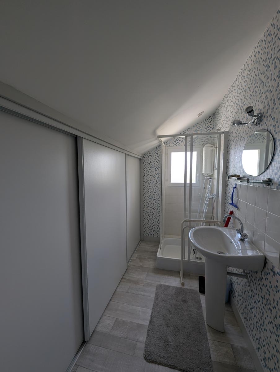 À l’étage : un palier deux grandes chambres, dont l’une bénéficie d’un espace de rangement, une salle de bains et wc