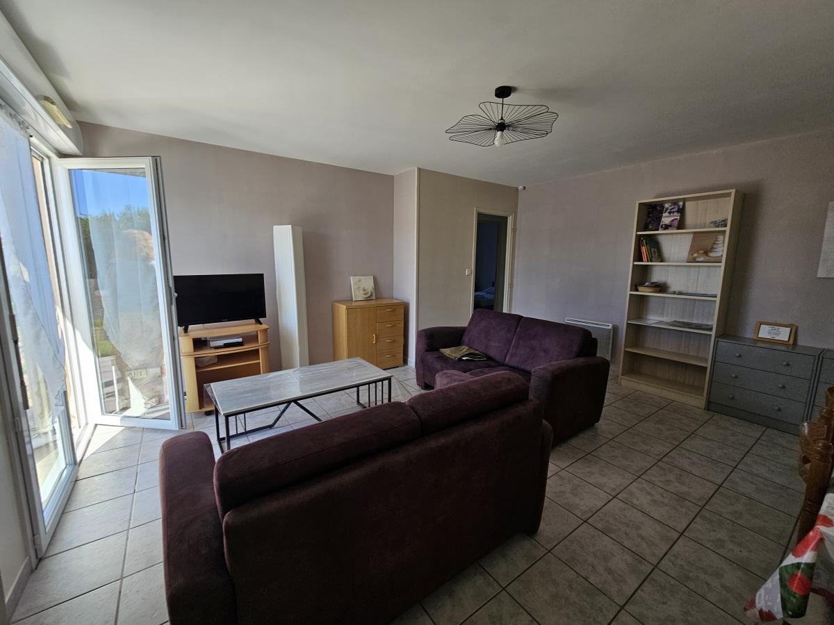 Une entrée donnant sur un séjour/salon lumineux, avec accès à une terrasse d'environ 15 m²