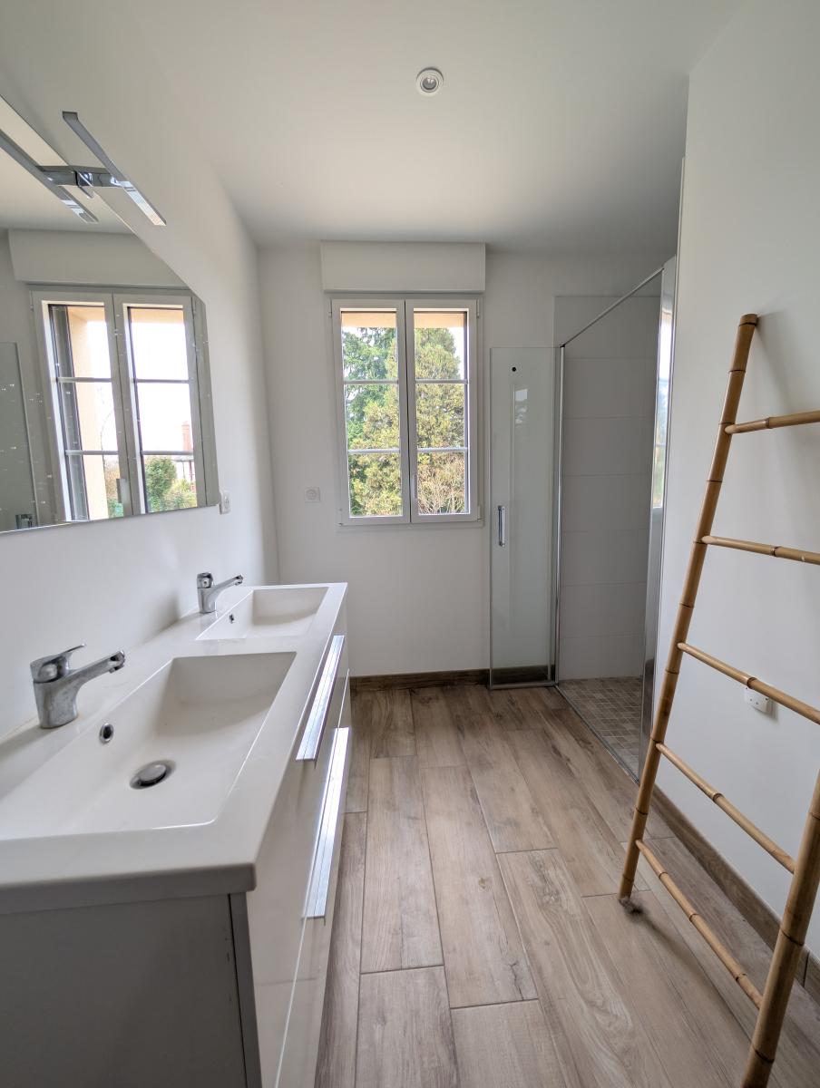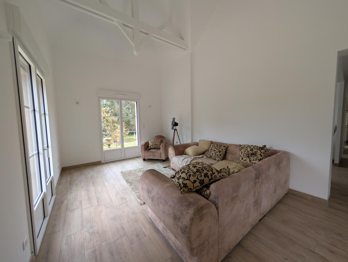 - Au rez-de-chaussée : entrée, cellier, double séjour de 32m², espace cuisine, dégagement avec placard distribuant deux chambres, salle de douche et WC séparés