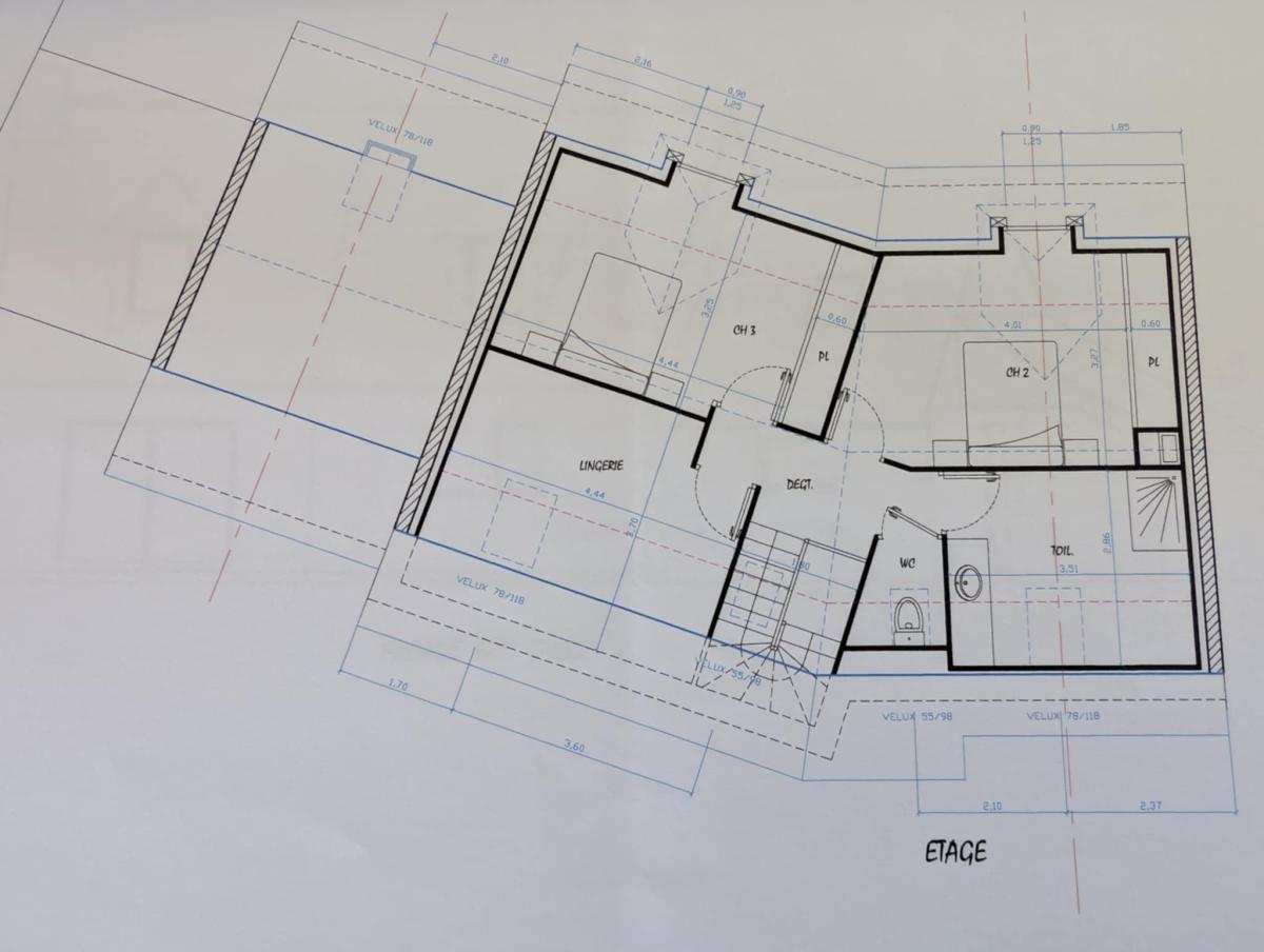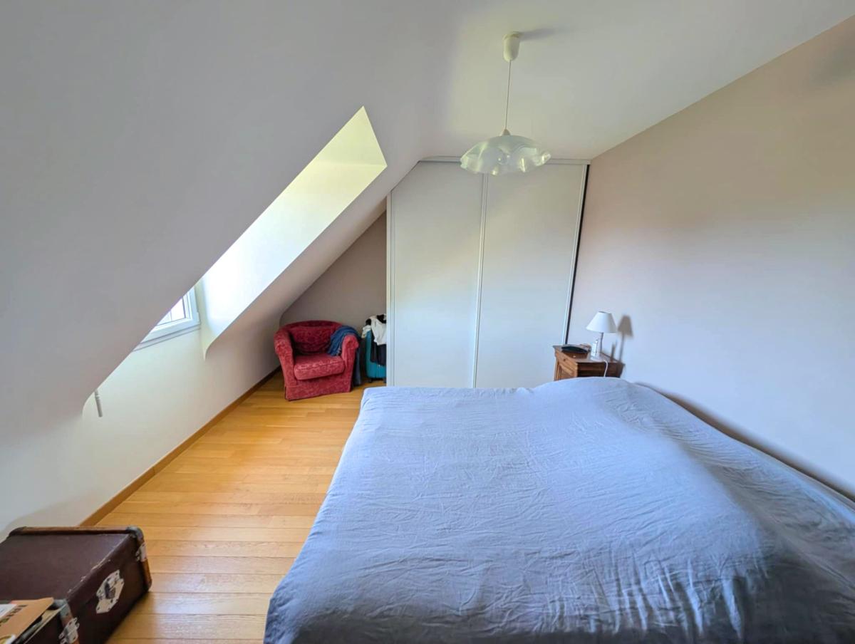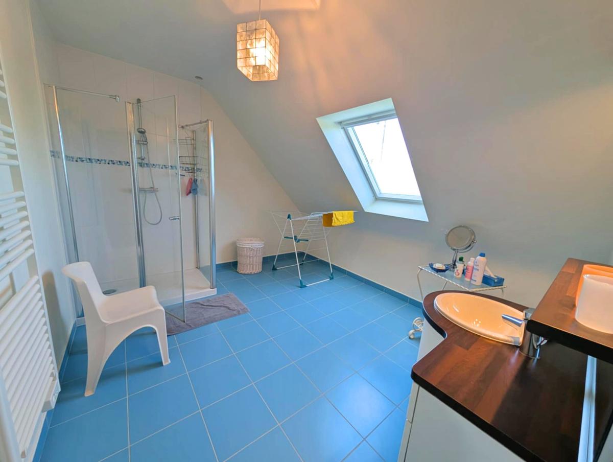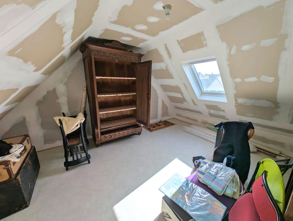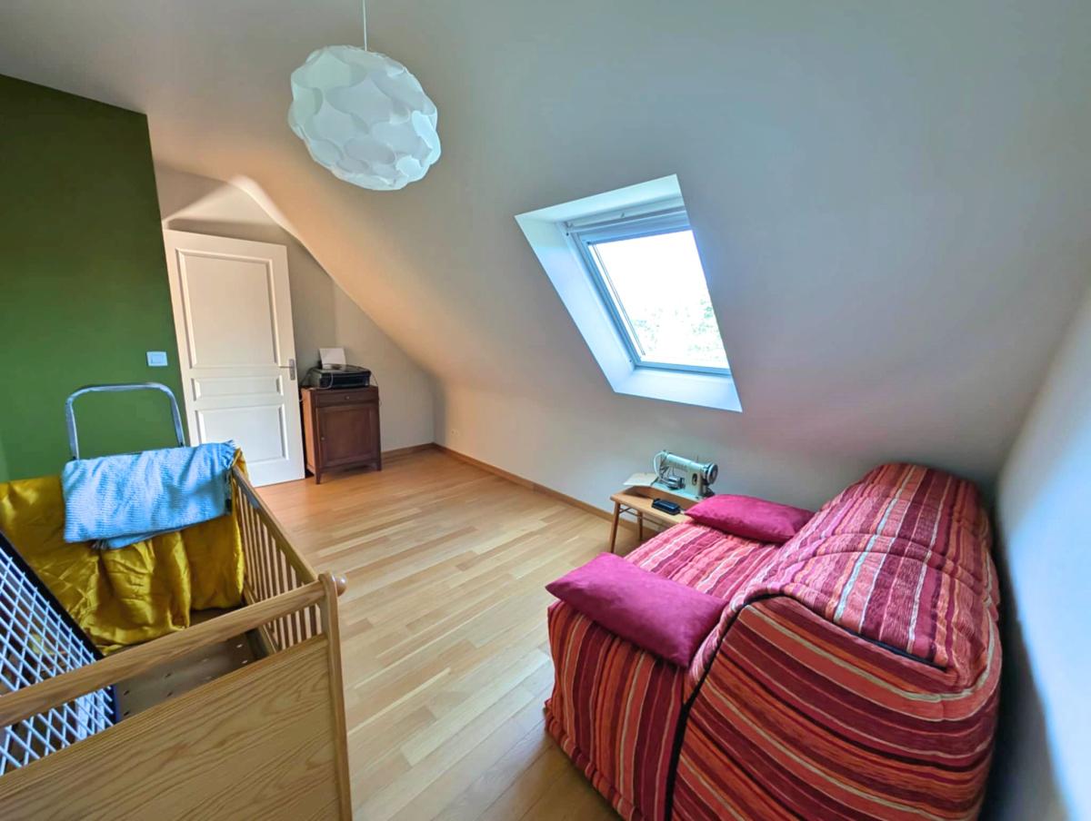 À l’étage, une grande salle d’eau, deux chambres lumineuses, un bureau et un grenier déjà isolé et plaqué, prêt à accueillir une quatrième chambre.