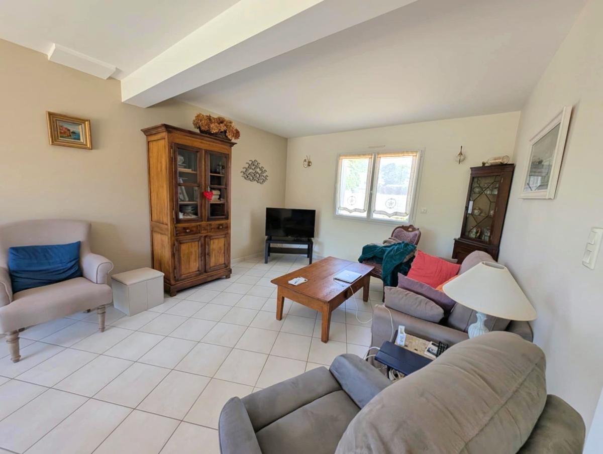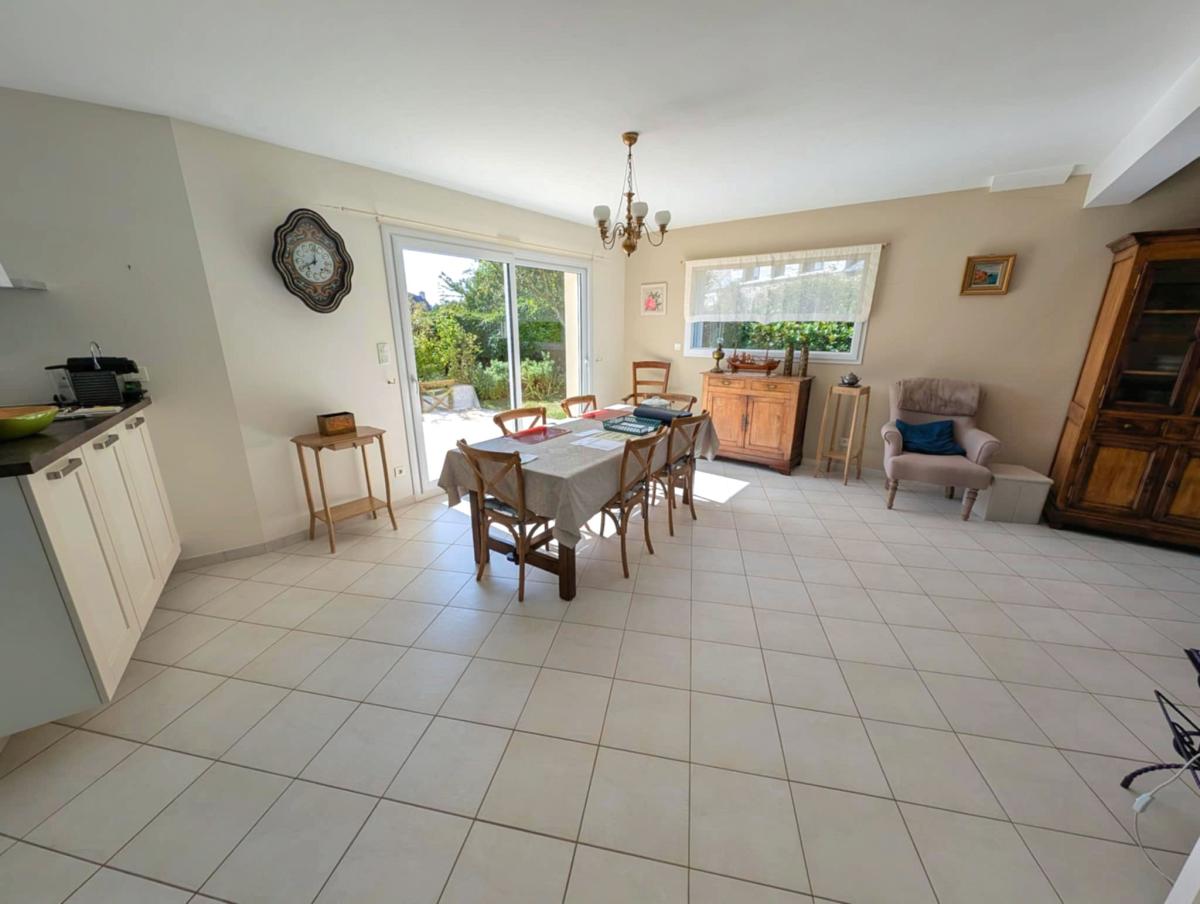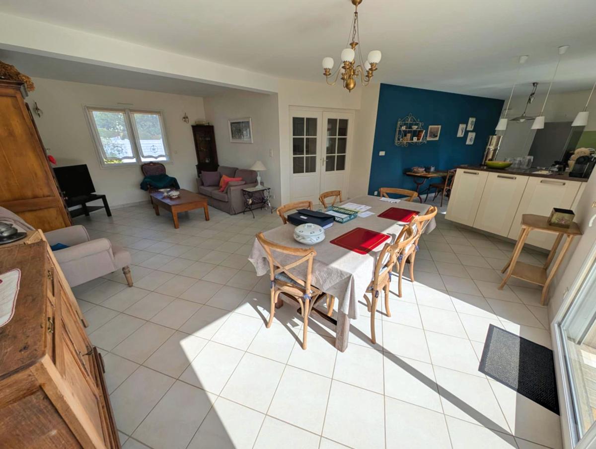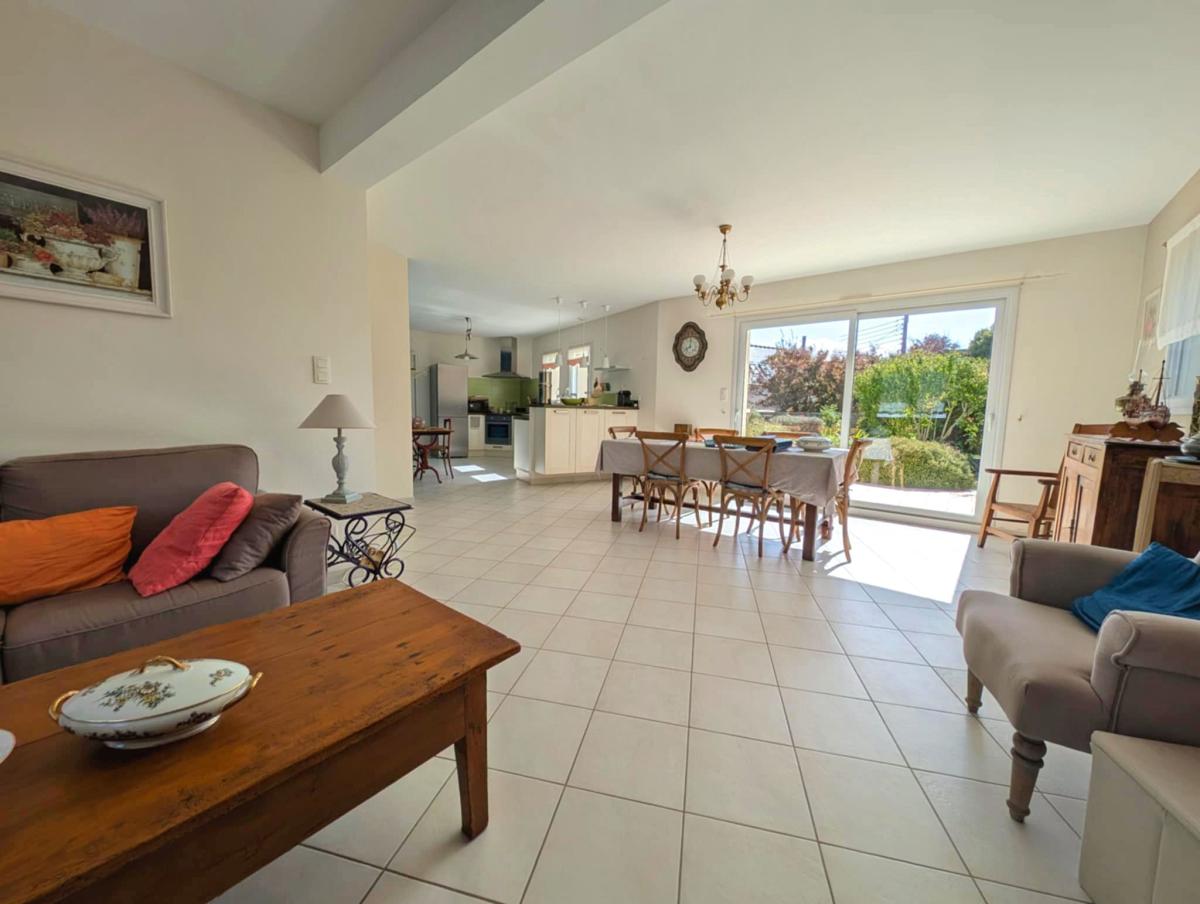 Spacieuse pièce de vie traversante avec cuisine ouverte, aménagée et équipée, donnant sur une terrasse bien exposée et un jardin ensoleillé.