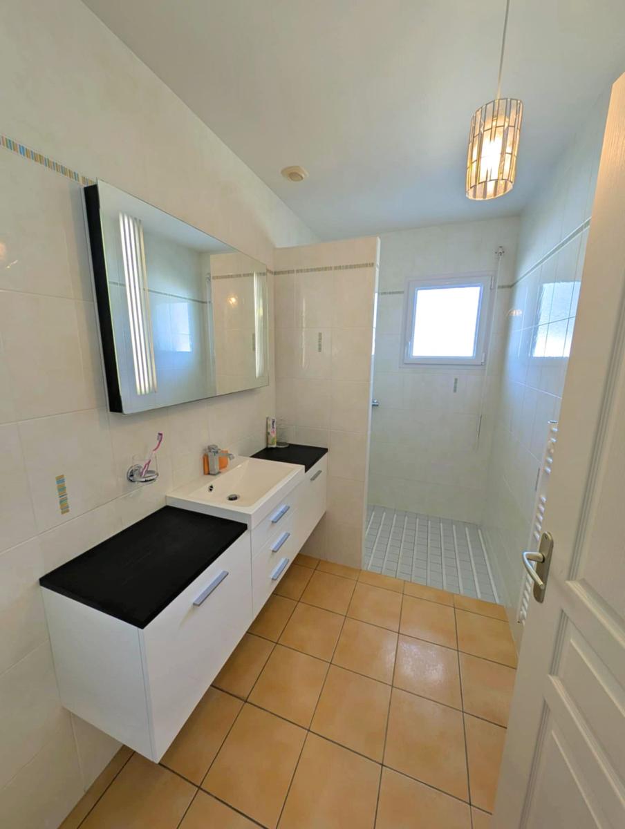 Au rez-de-chaussée, une chambre avec rangements et une salle d’eau, offrant un vrai confort de plain-pied.