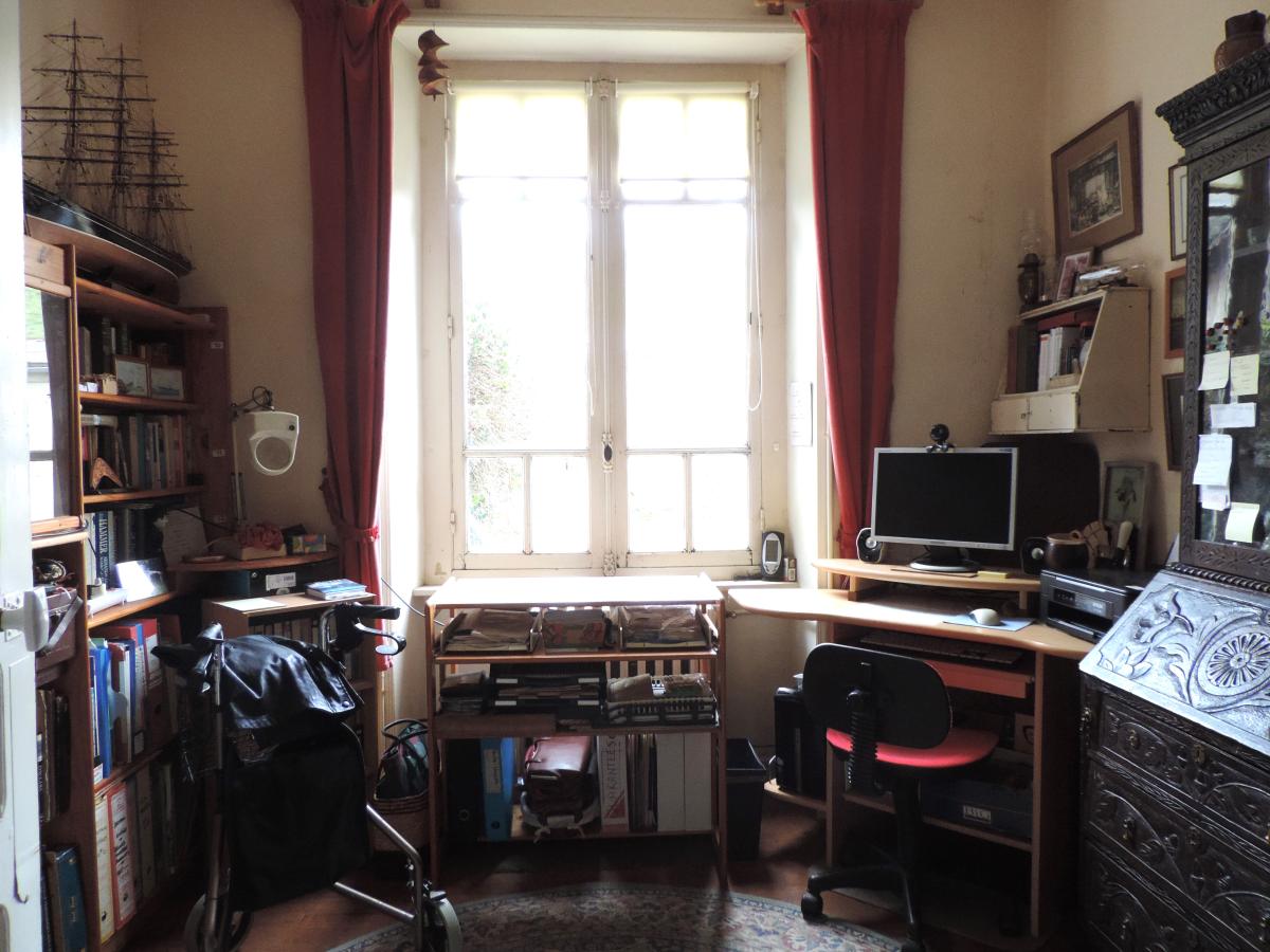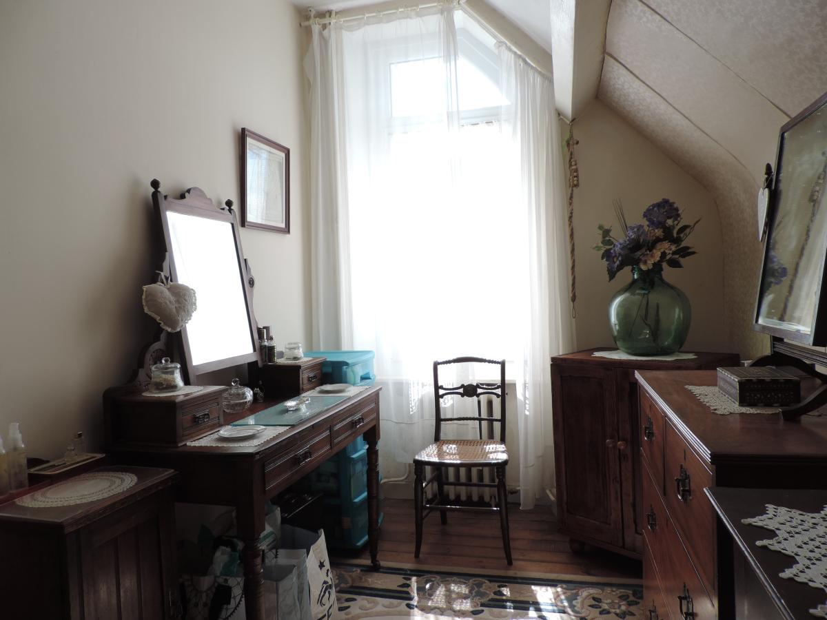 A l'étage un palier desservant une chambre avec un cabinet de toilette/w.c, une autre chambre avec boudoir (bureau) donnant sur un balcon, et une salle de bains avec w.c. Combles.