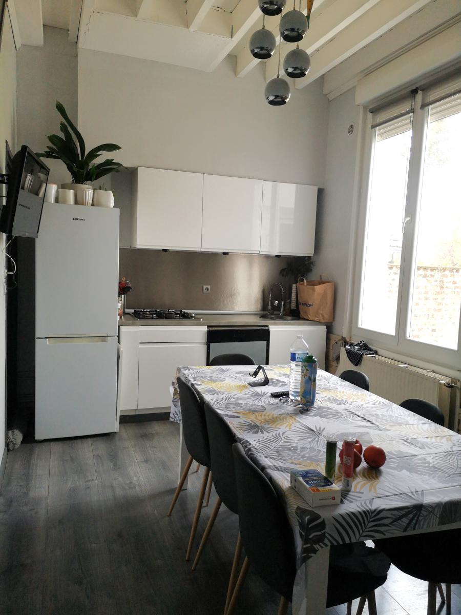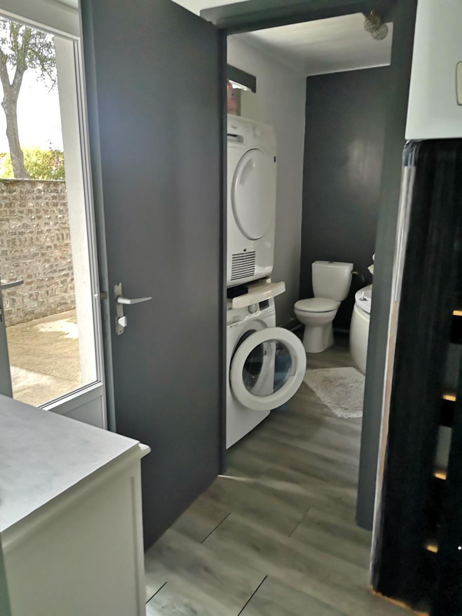 Entrée sur salon-salle à manger, cuisine équipée, salle de bains et wc ;