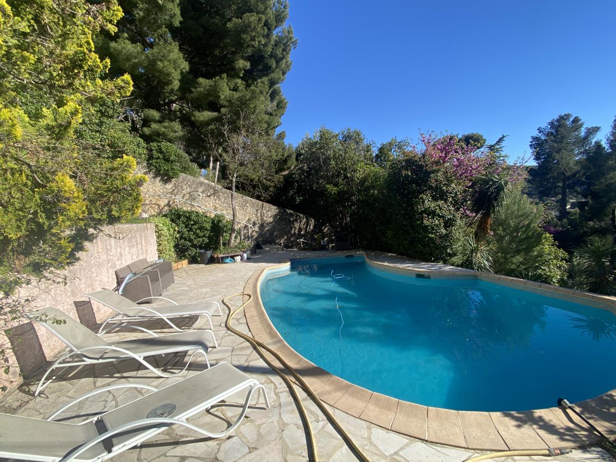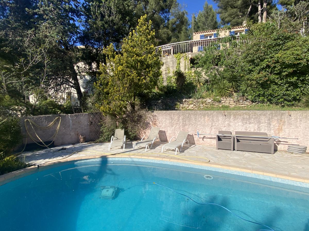 salle d'eau avec toilettes. Sur 2185 m² de terrain clos en restanques, avec parking, garage, piscine et atelier. La vue panoramique depuis la terrasse de 70 m2 est exceptionnelle.