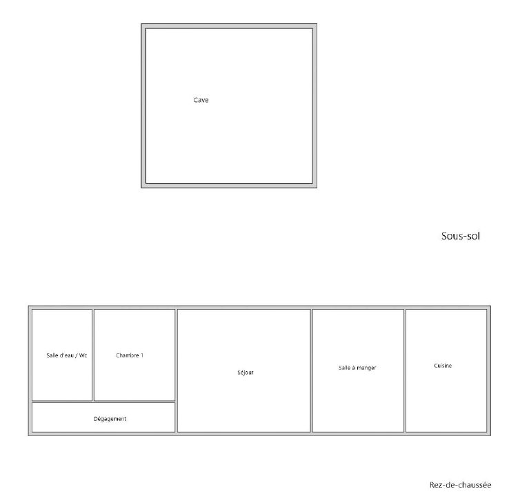 - Au rez-de-chaussée : entrée, un salon d'env. 26m² ouvert sur la salle à manger d'env. 12m², une cuisine aménagée d'env. 14m², couloir avec placard, une chambre d'env. 9m², salle d'eau avec WC suspendus.