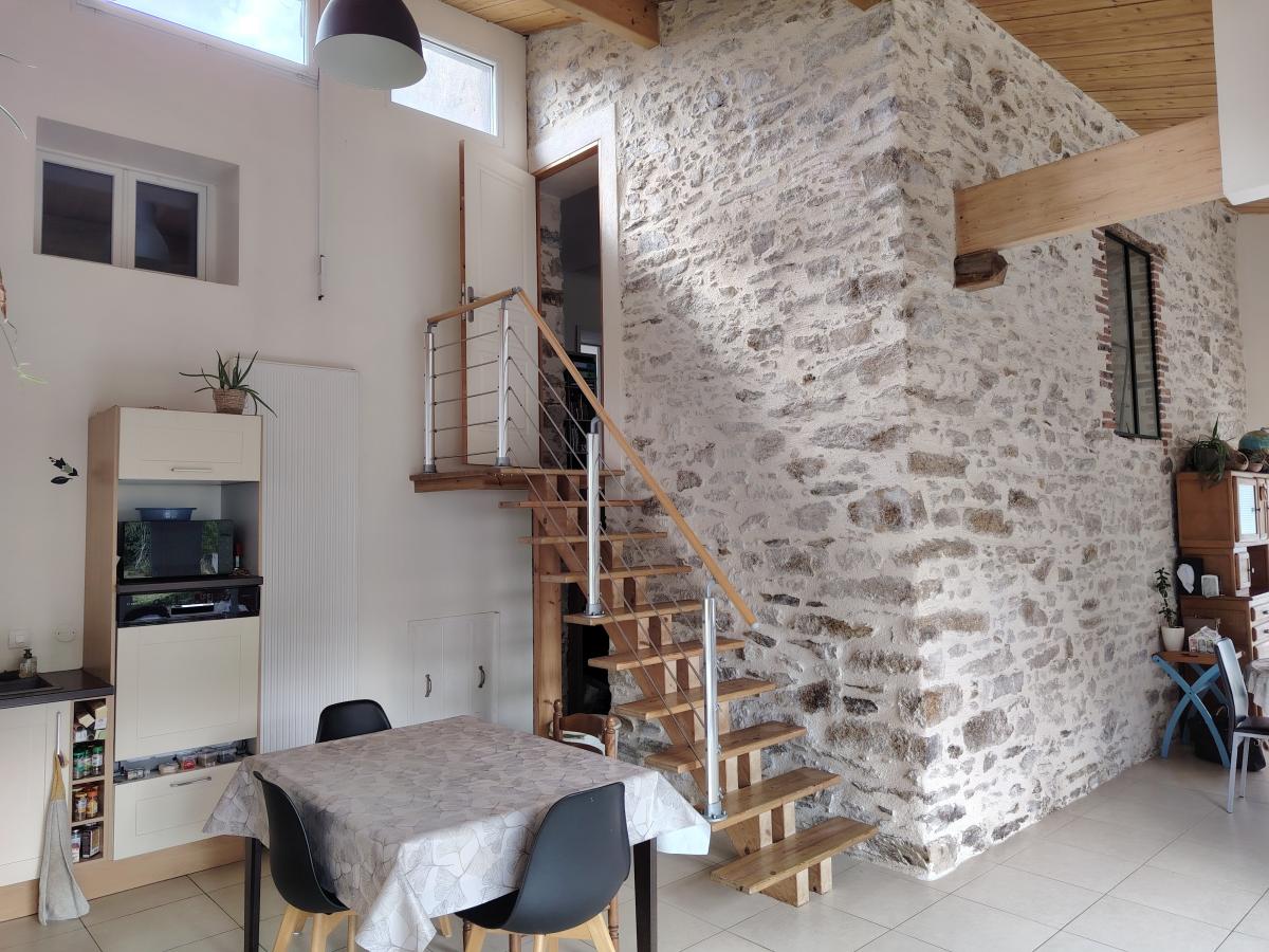 Dans un village au calme, à 6km de la gare de CLISSON, à environ 30km de NANTES et de CHOLET, maison ancienne agrandie en 2011 de 120m² habitables sur terrain de 1 193m² en zone constructible. Coté jardin: agréable pièce de vie avec mur en pierres apparentes et plafond cathédrale de 47m² lumineuse donnant sur une terrasse avec une cuisine aménagée et équipée, une arrière-cuisine, des wc et un garage avec un faux-grenier puis au niveau supérieur: une pièce de 25m² à utiliser comme vous le souhaitez: bureau, salle de jeux, bibliothèque... desservant deux chambres avec placard plus une salle d'eau, des wc et une troisième chambre avec rangement et salle de bains privative. En complément : deux pièces de 25m²chacune en sous-sol, avec accès direct au jardin, à usage d'atelier et chaufferie plus un appentis attenant à la maison. Terrain pour piscine, potager, verger ou construction. Chaudière fioul (consommation énergétique annuelle totale d'environ 2 300 €), panneaux aérovoltaïques avec revenus annuels d'environ 1350 €, ouvertures PVC/DV.