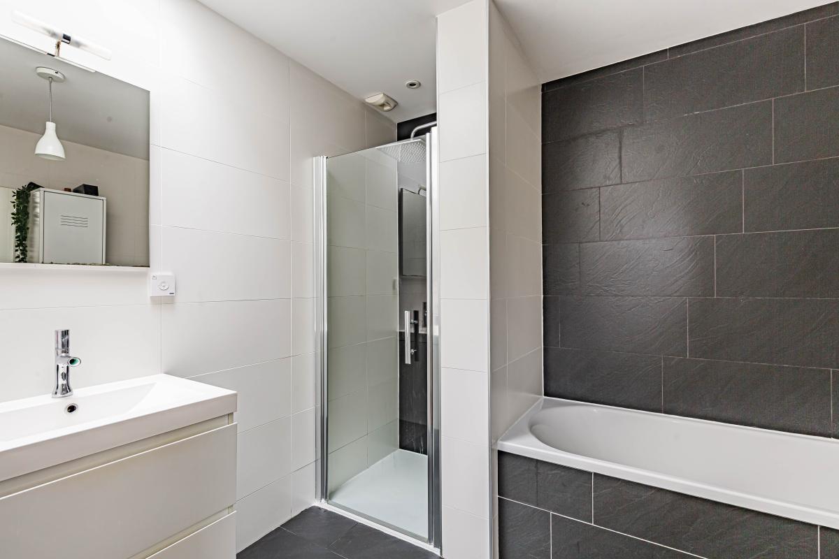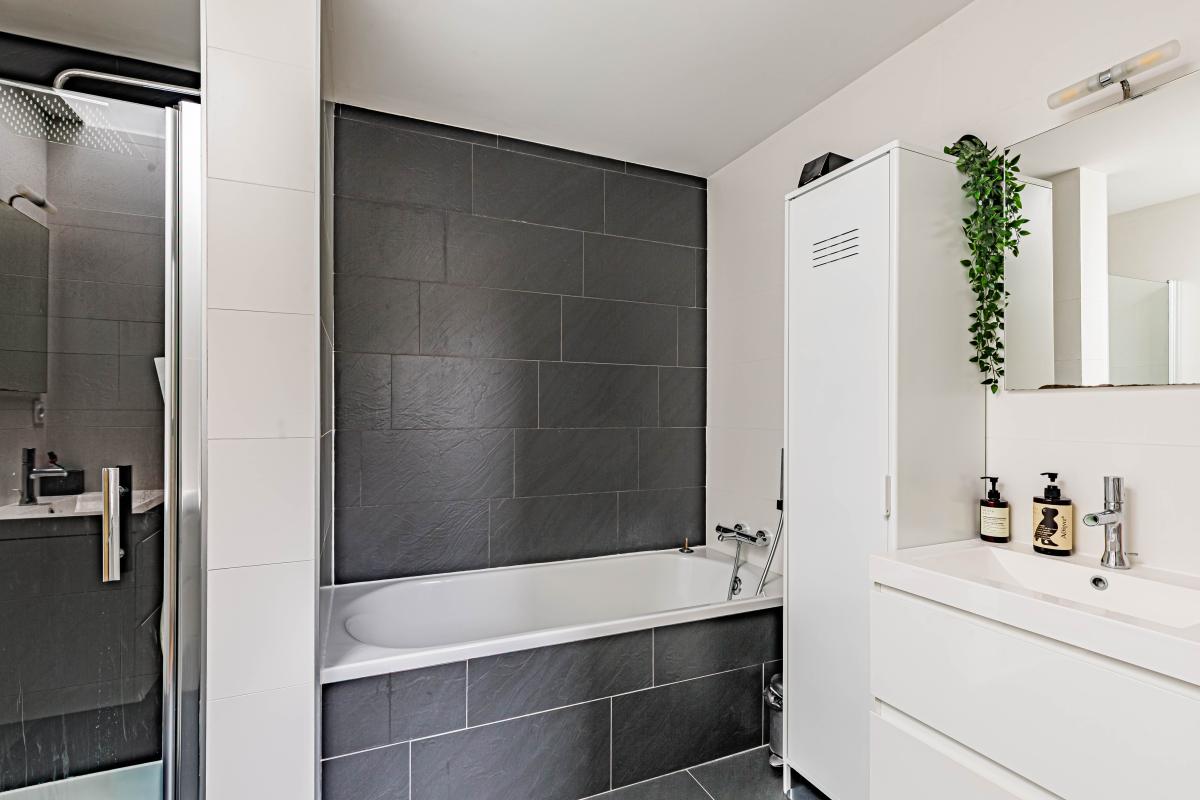 WC avec lave-mains indépendants, garage avec porte motorisée, évacuation présente pour entreposer le coin buanderie, baie vitrée sécurit opacifiée pour un apport de lumière extérieur.
