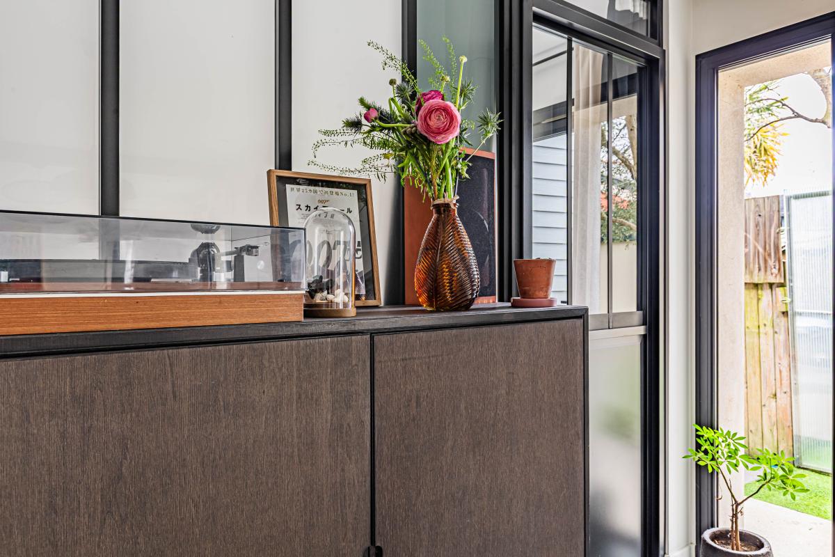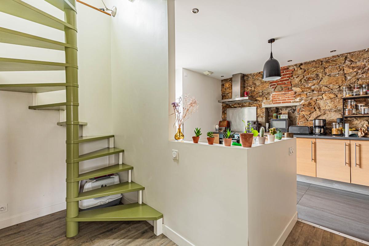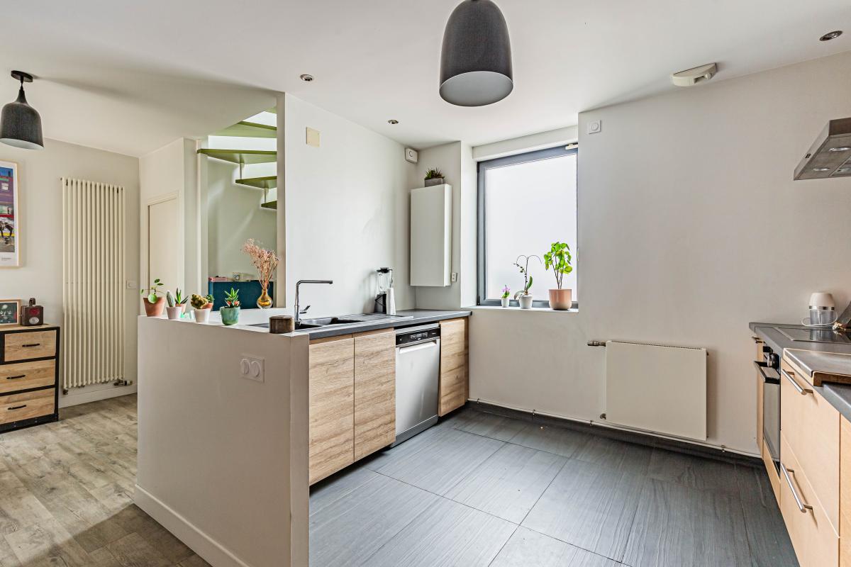 La cuisine entièrement équipée et aménagée avec goût est située de l'autre côté du hall, côté rue.