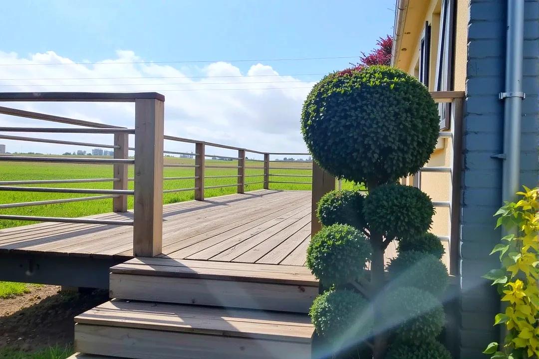 Au rez-de-chaussée : une LUMINEUSE pièce de vie de 46m² avec cuisine et baie donnant sur une GRANDE TERRASSE en bois exposée PLEIN SUD, une chambre, une salle de bains, WC avec lave-mains,